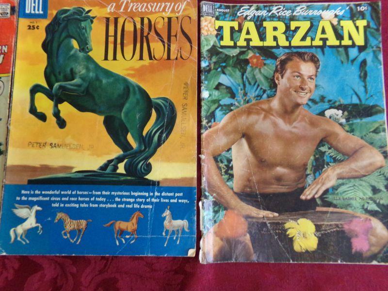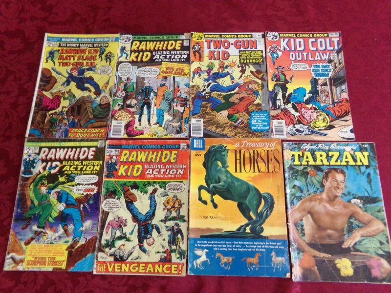 RAWHIDE KID, TWO-GUN KID, KID COLT, TARZAN AND A TREASURY OF HORSES. THEY ARE IN FAIR CONDITION.