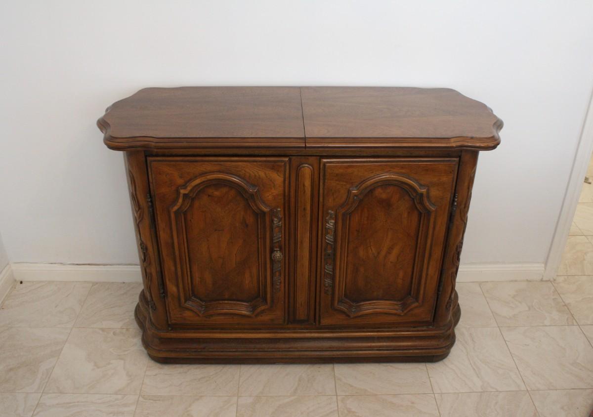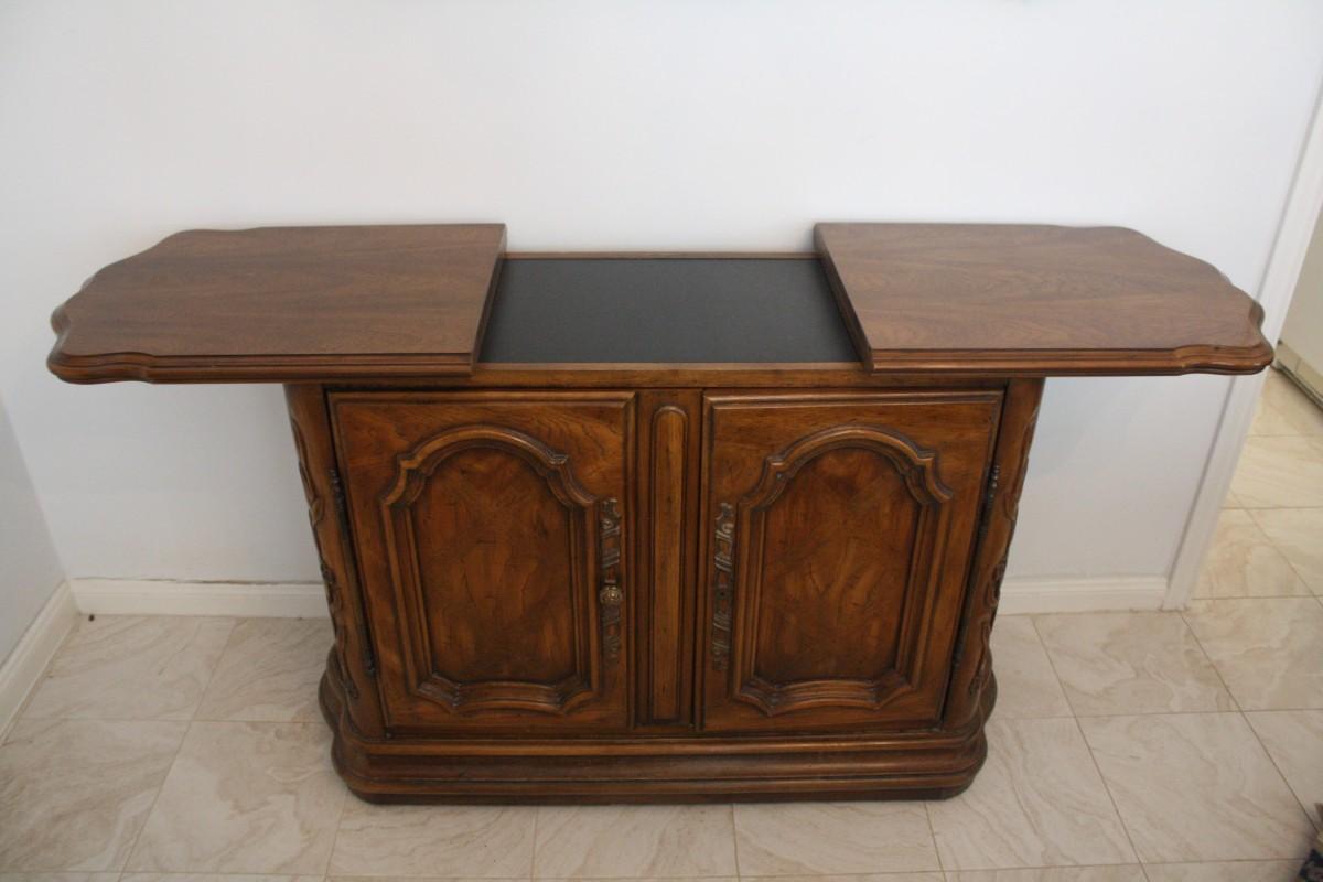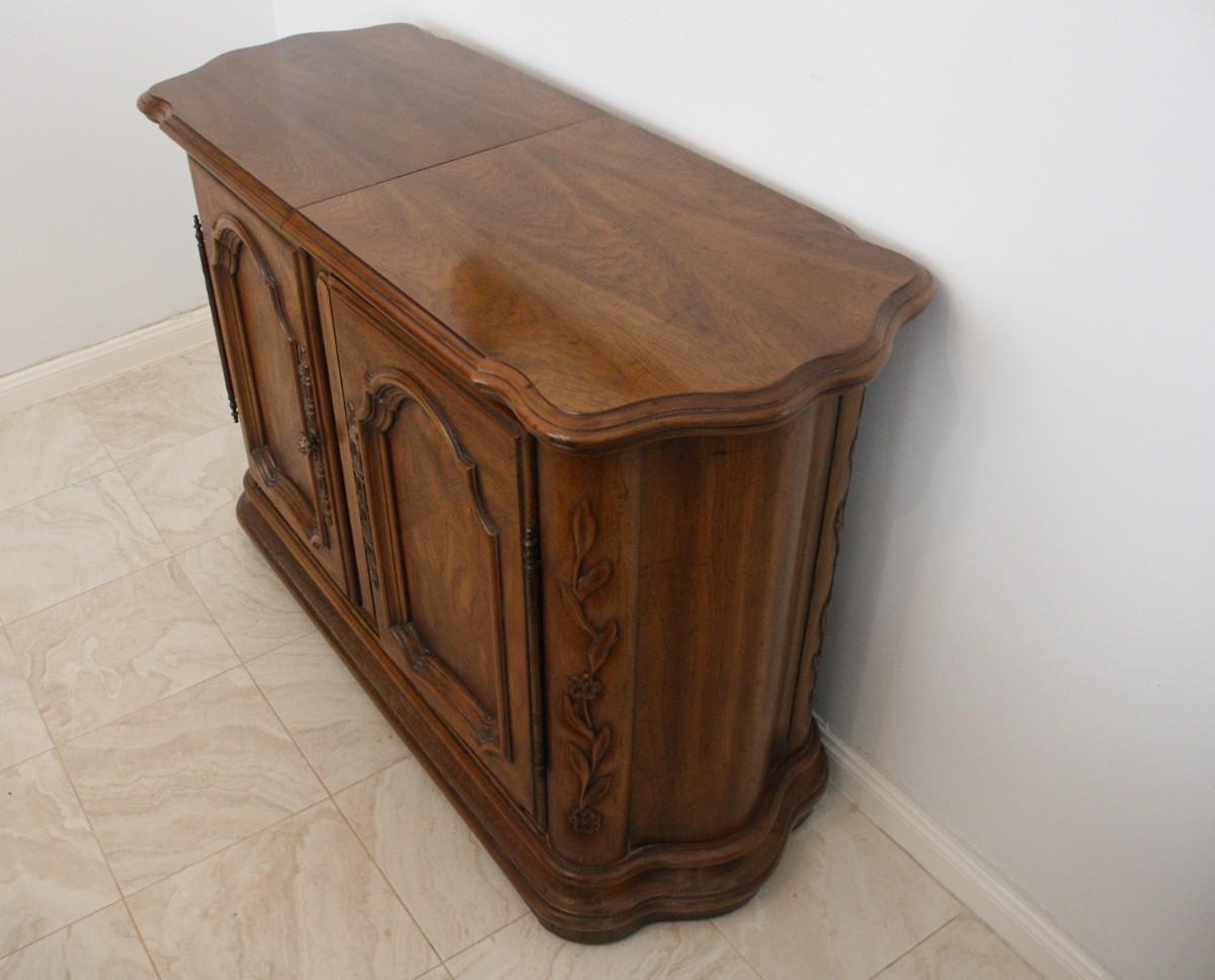 Drexel Heritage Adjustable Length Buffet- Romantic style buffet with cherry solids and veneers with maple effects with carved floral detailing. Made by Drexel with removable drawer for silver storage and adjustable top storage. Measures 45" width 18" depth and 31" height. One of the knobs is missing.