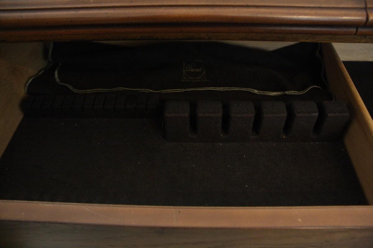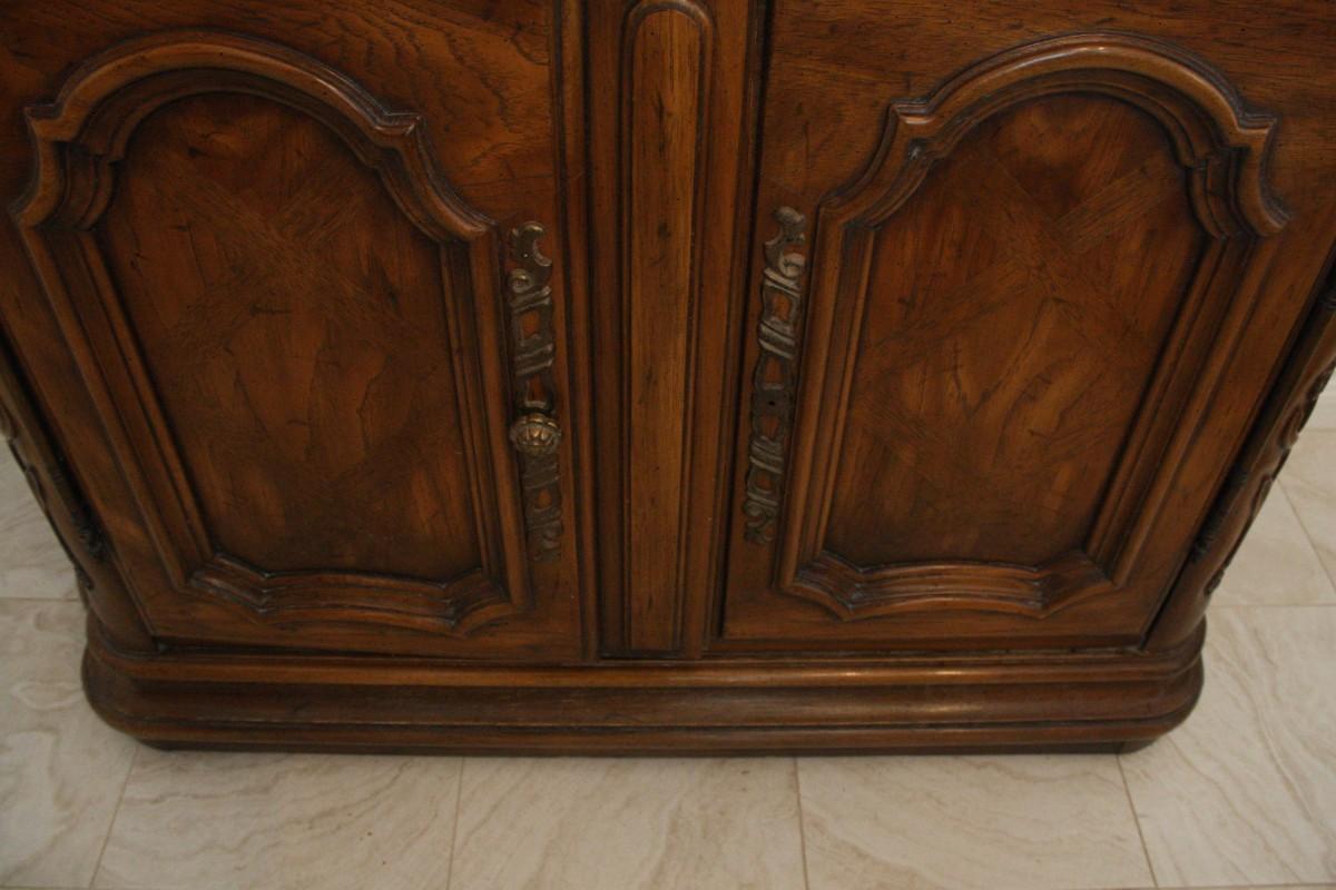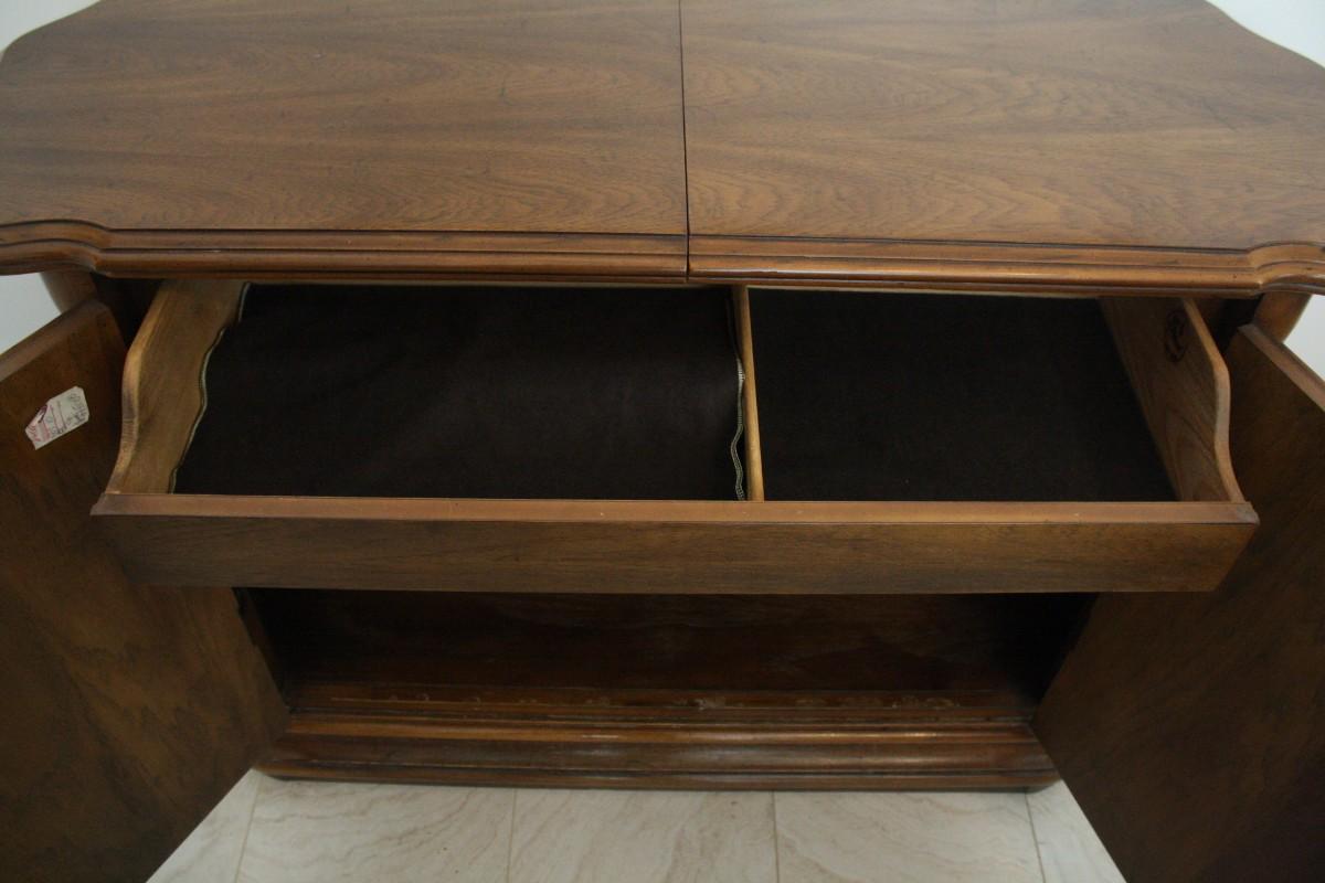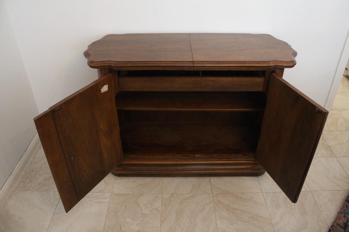 Drexel Heritage Adjustable Length Buffet- Romantic style buffet with cherry solids and veneers with maple effects with carved floral detailing. Made by Drexel with removable drawer for silver storage and adjustable top storage. Measures 45" width 18" depth and 31" height. One of the knobs is missing.