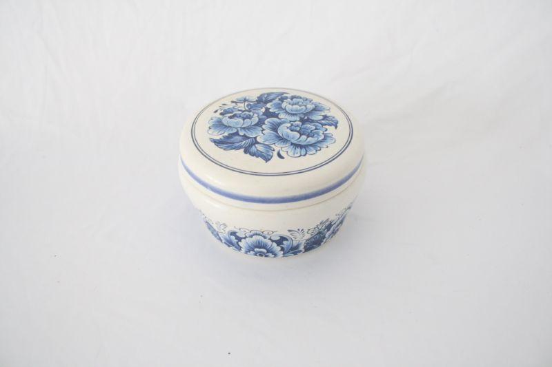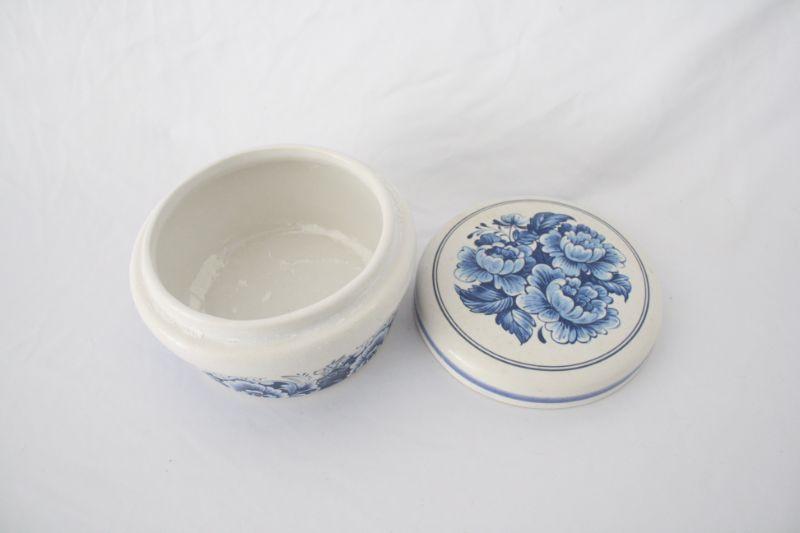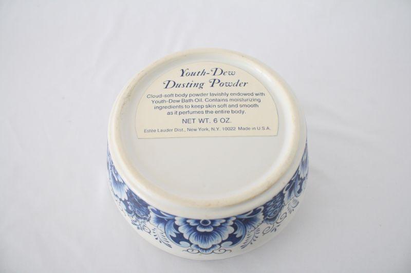 Vintage Estee Lauder Youth Dew Dusting Powder Porcelain Jar with Lid - Blue and white porcelain jar/pot with lid that was traditionally used for makeup dusting powder but can be used as a storage container or a variety of uses. Made by Estee Lauder. Approximately 6 inches across.