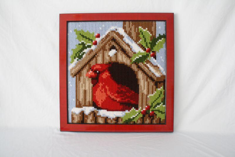 Vintage Framed Needlepoint Cardinal Art - Measures 18x18.5 inches.