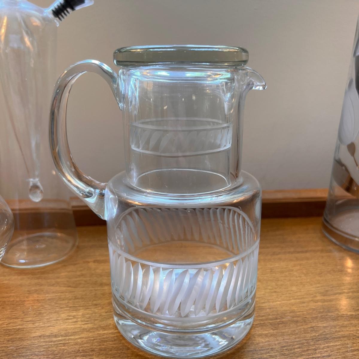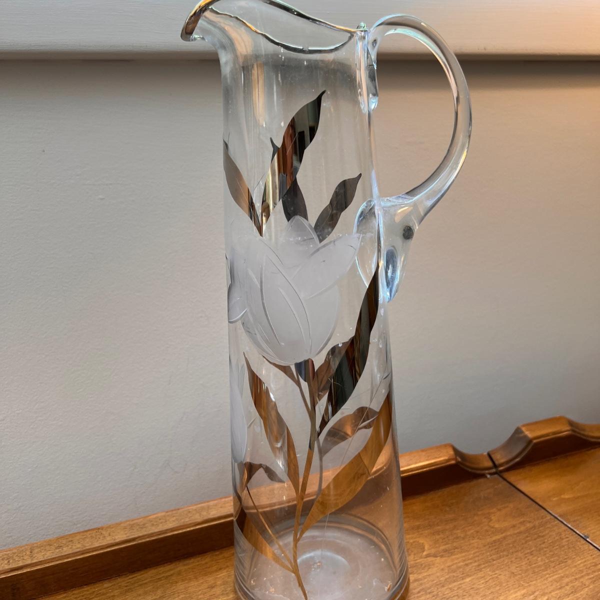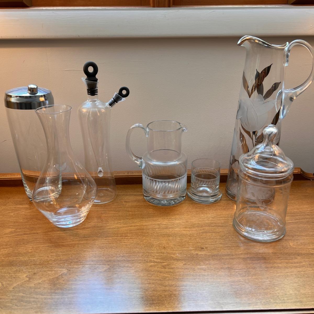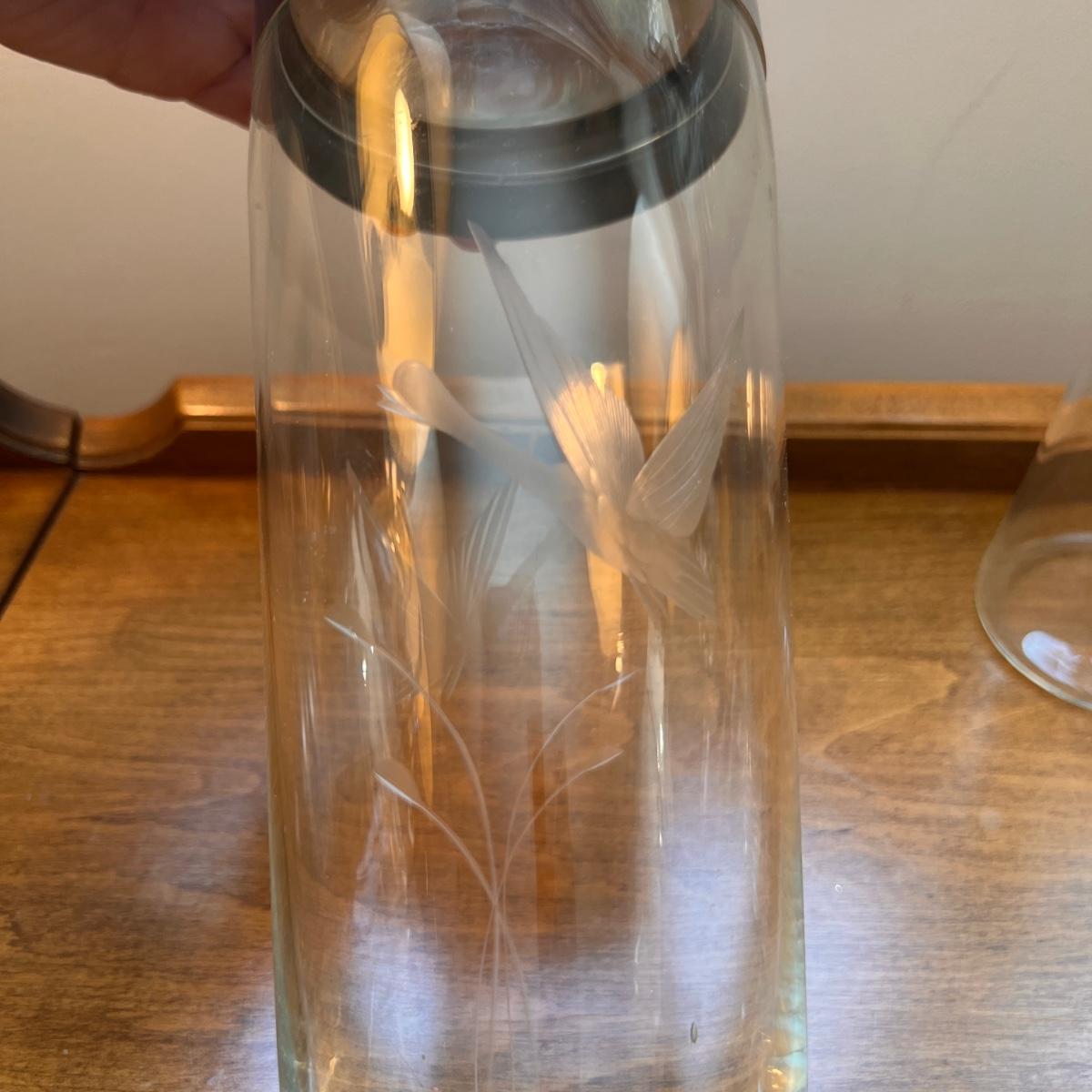 Etched crystal bedside pitcher and tumbler, Reidel Decanter, MCM Crystal glass pitcher w/ etched flowers & silver leaves (slight chip at rim as shown in pictures), etched cocktail shaker, etched apothecary jar, oil and vinegar cruet.