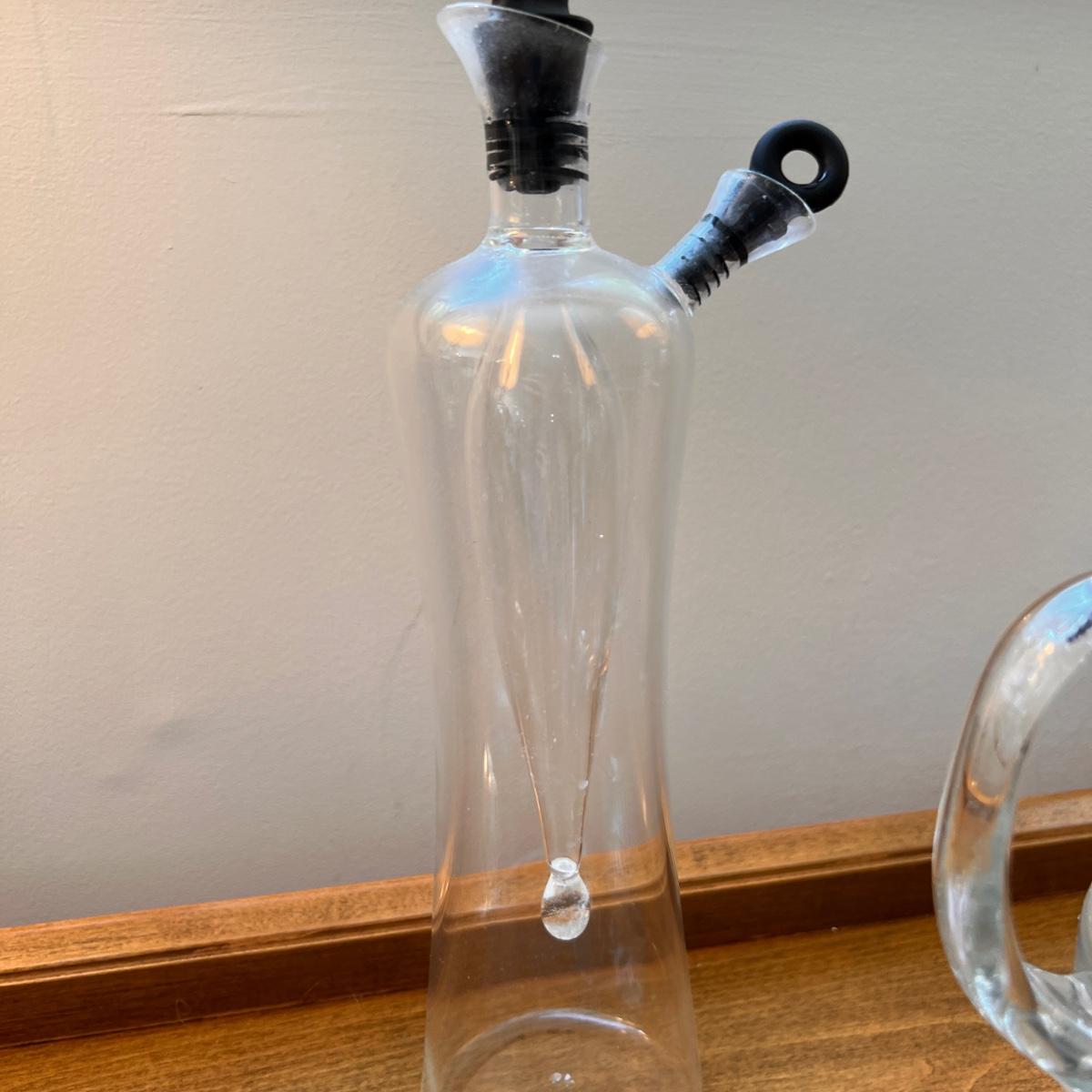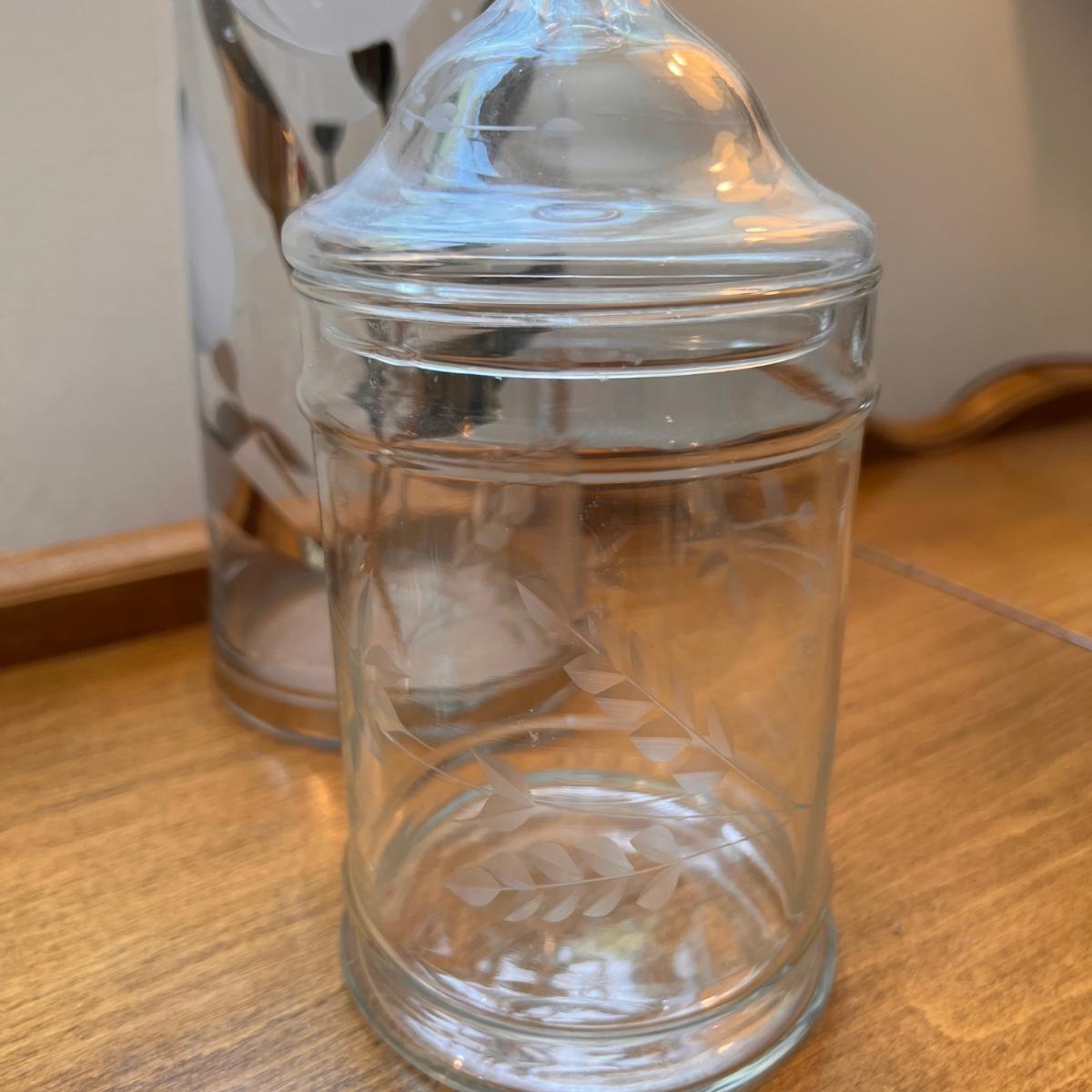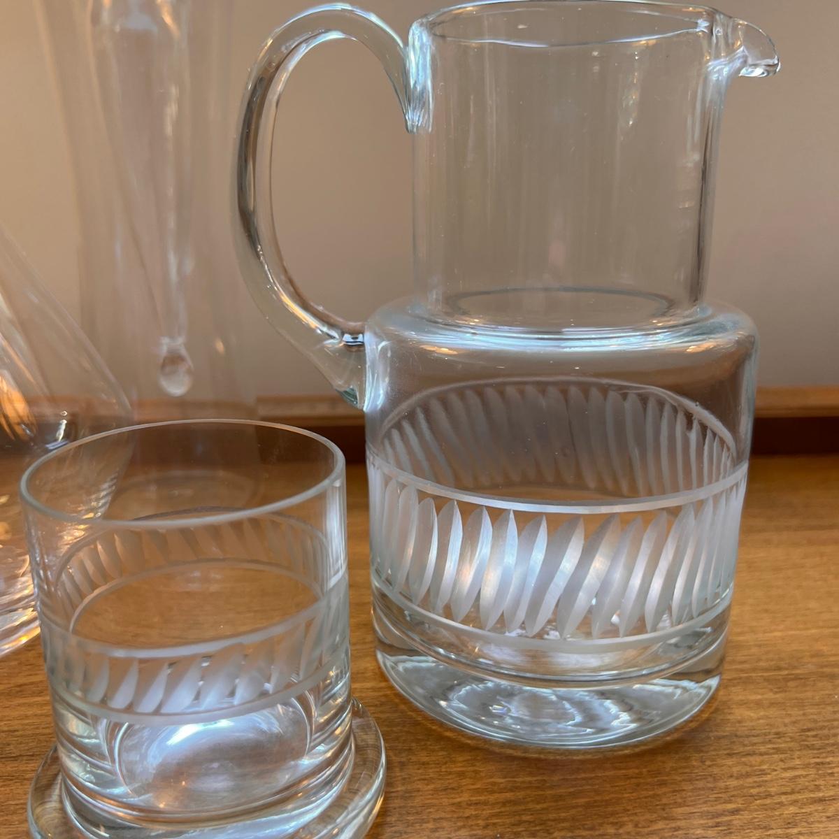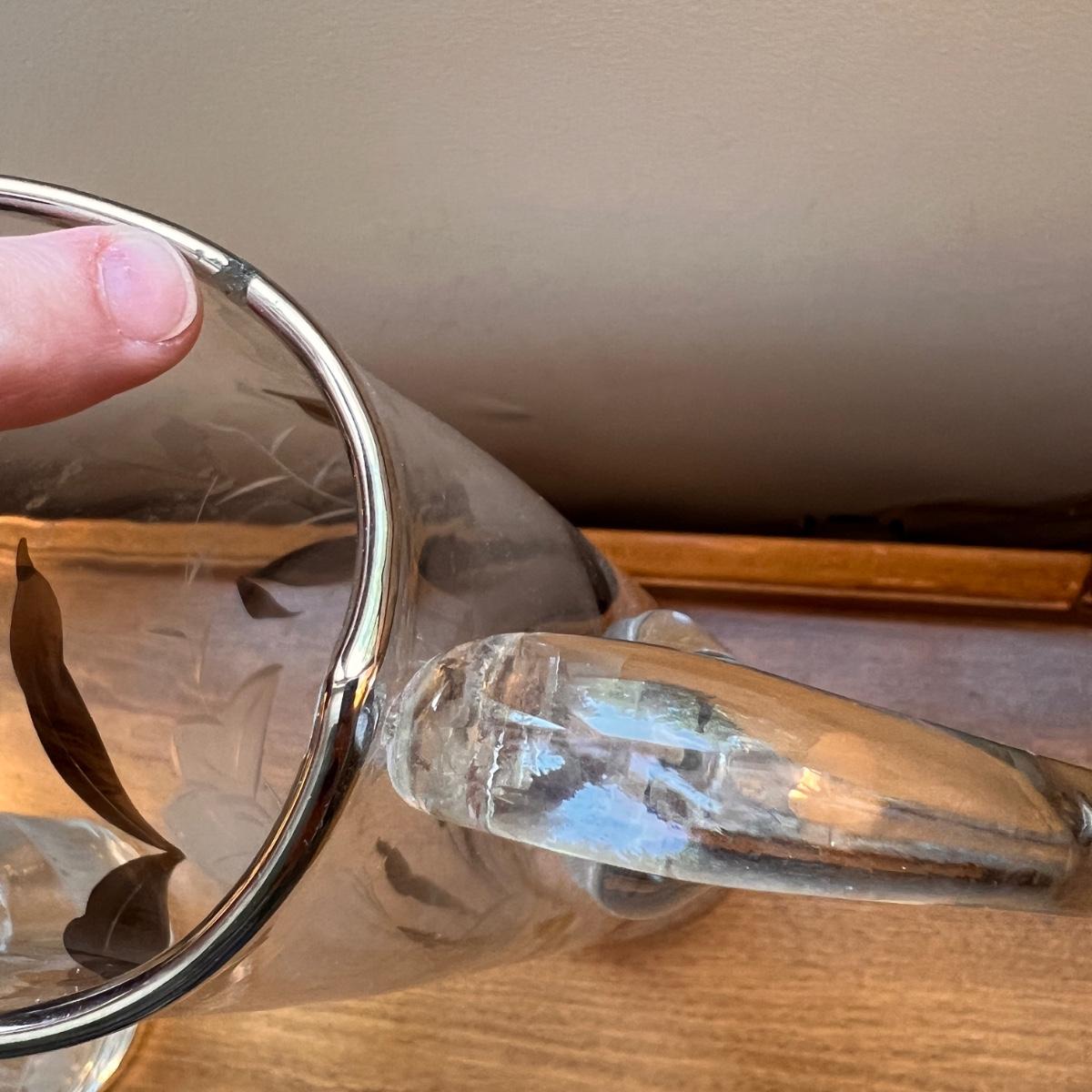 Etched crystal bedside pitcher and tumbler, Reidel Decanter, MCM Crystal glass pitcher w/ etched flowers & silver leaves (slight chip at rim as shown in pictures), etched cocktail shaker, etched apothecary jar, oil and vinegar cruet.