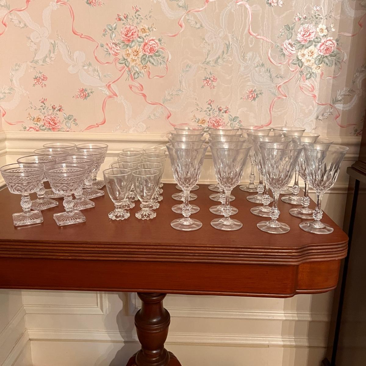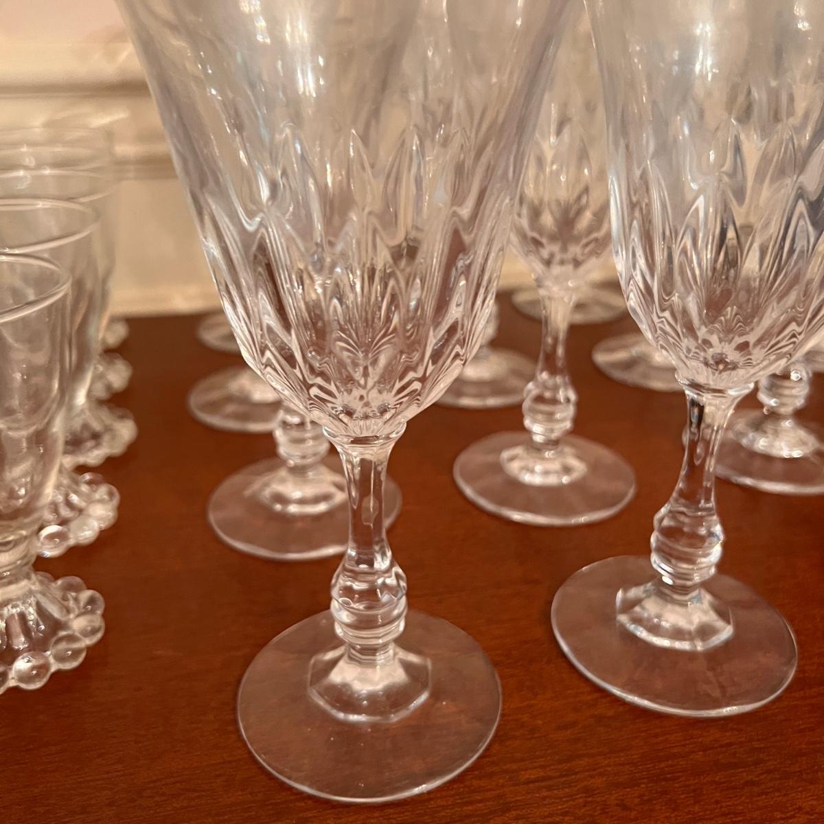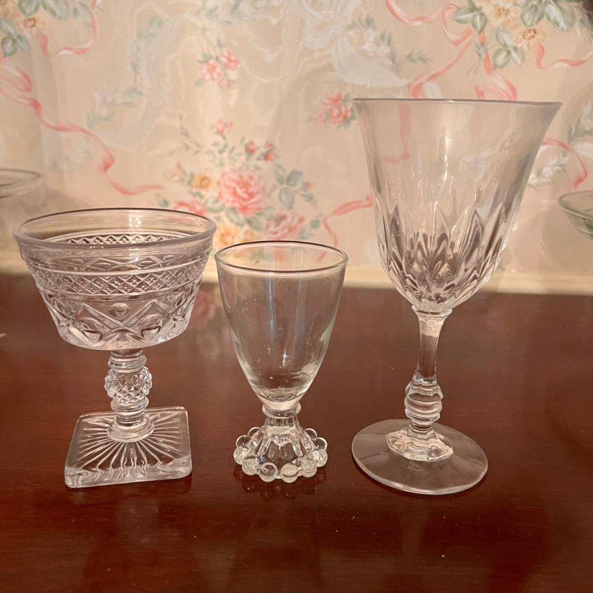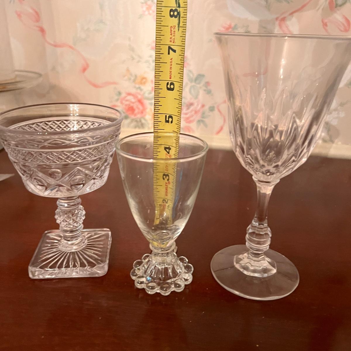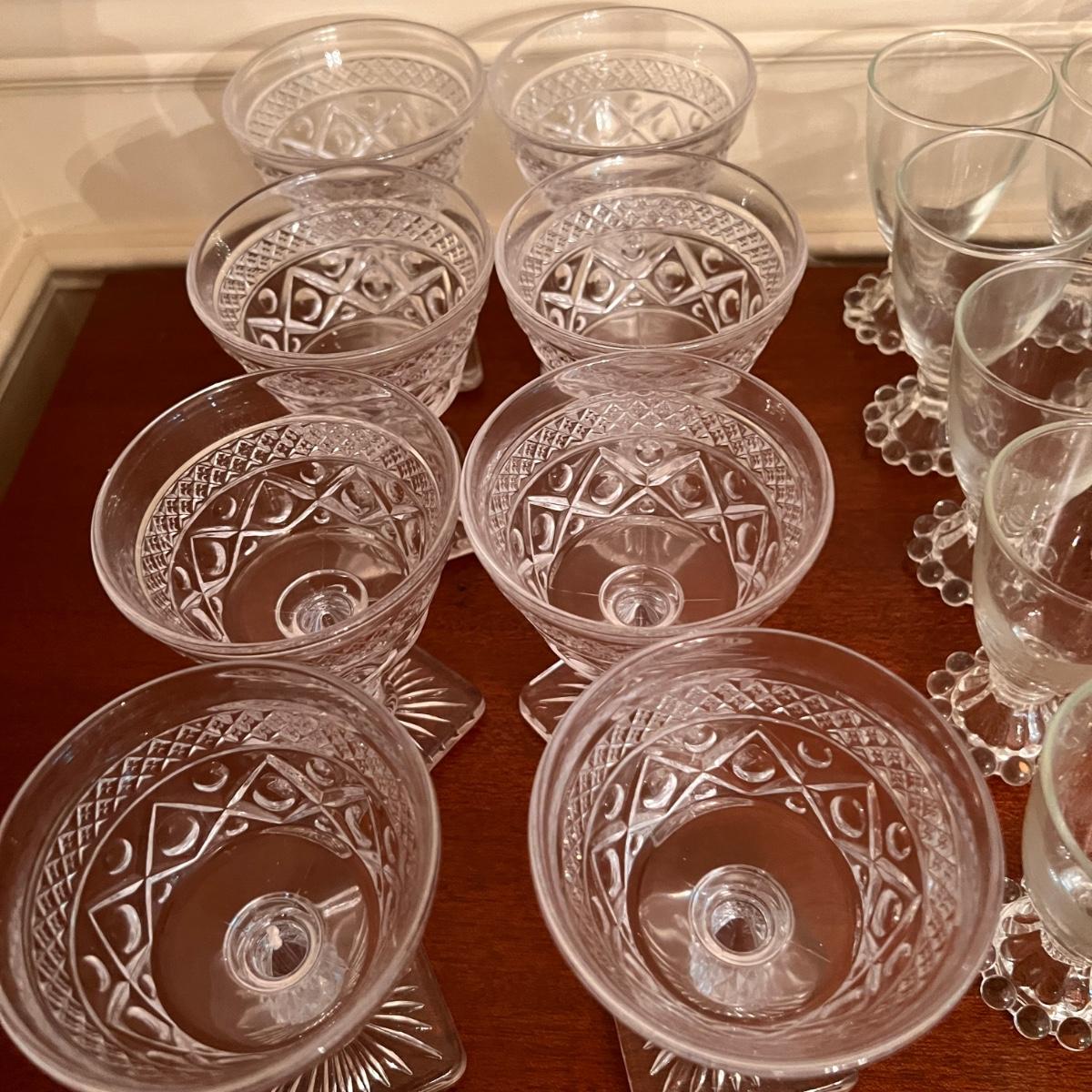8 Cape Cod pattern imperial glass footed sorbet glass cup dish. 10 Anchor Hocking Boopie Berwick Bubble Crystal Juice Glass. 16 Lead Crystal Water Goblets Kimberly Platinum by FOSTORIA. These glasses are heavy and definitely very high quality. All of them are in excellent condition.
