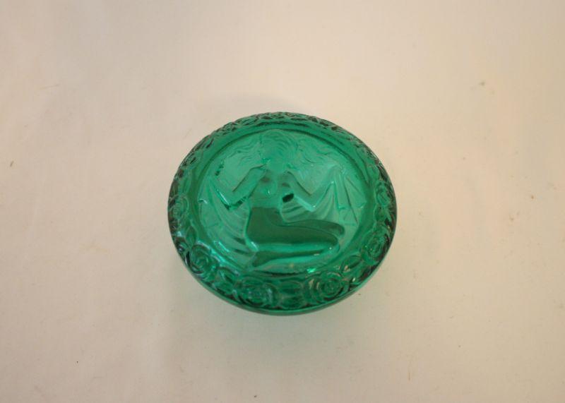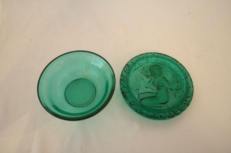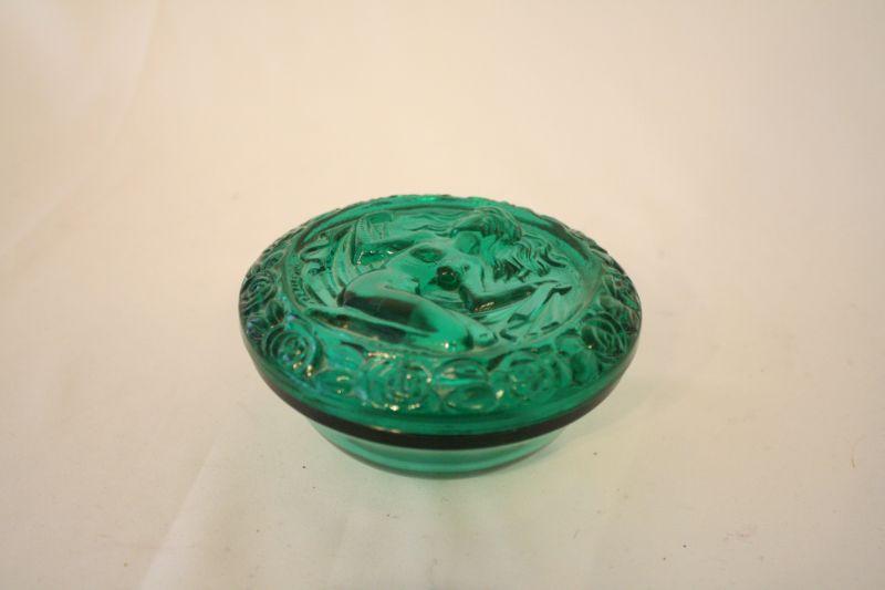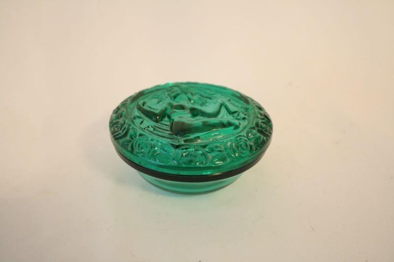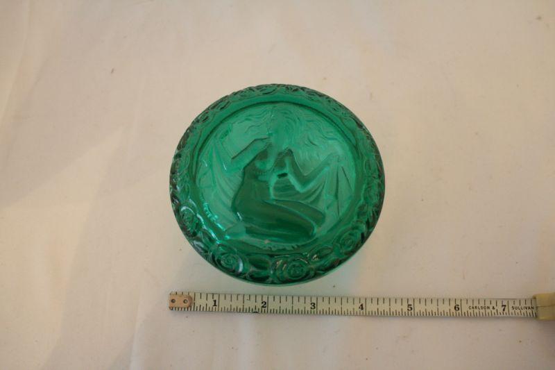 Vintage Green Aqua Glass Trinket Container - Beautiful small colored glass trinket box with a woman design on the lid. Measures 4.5" inches across.
