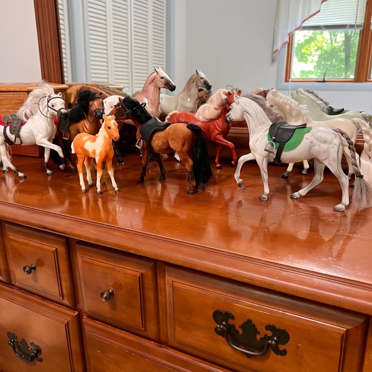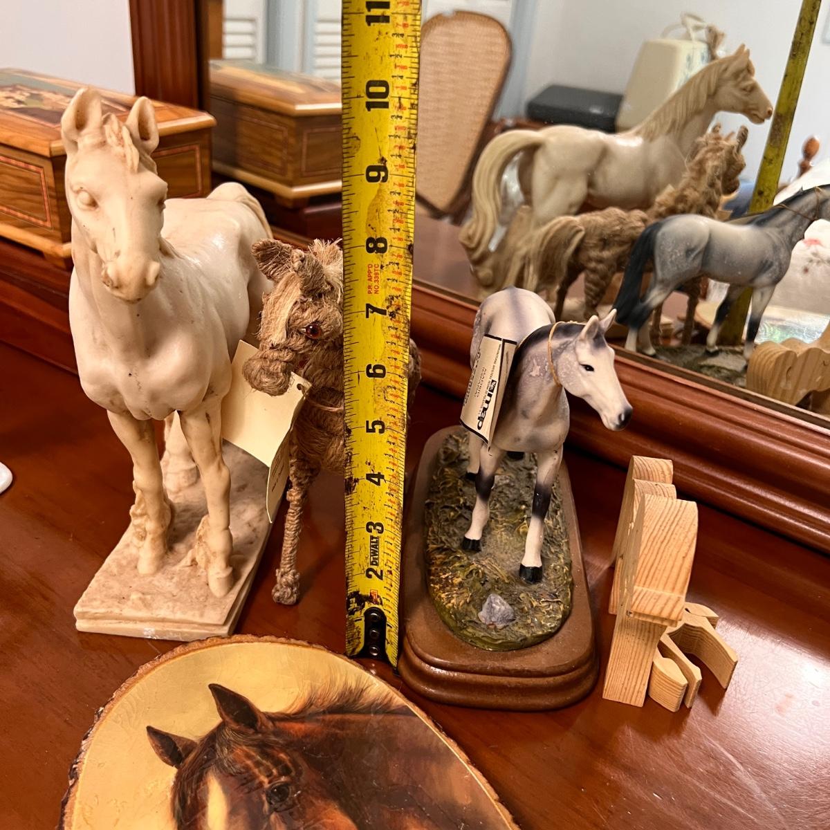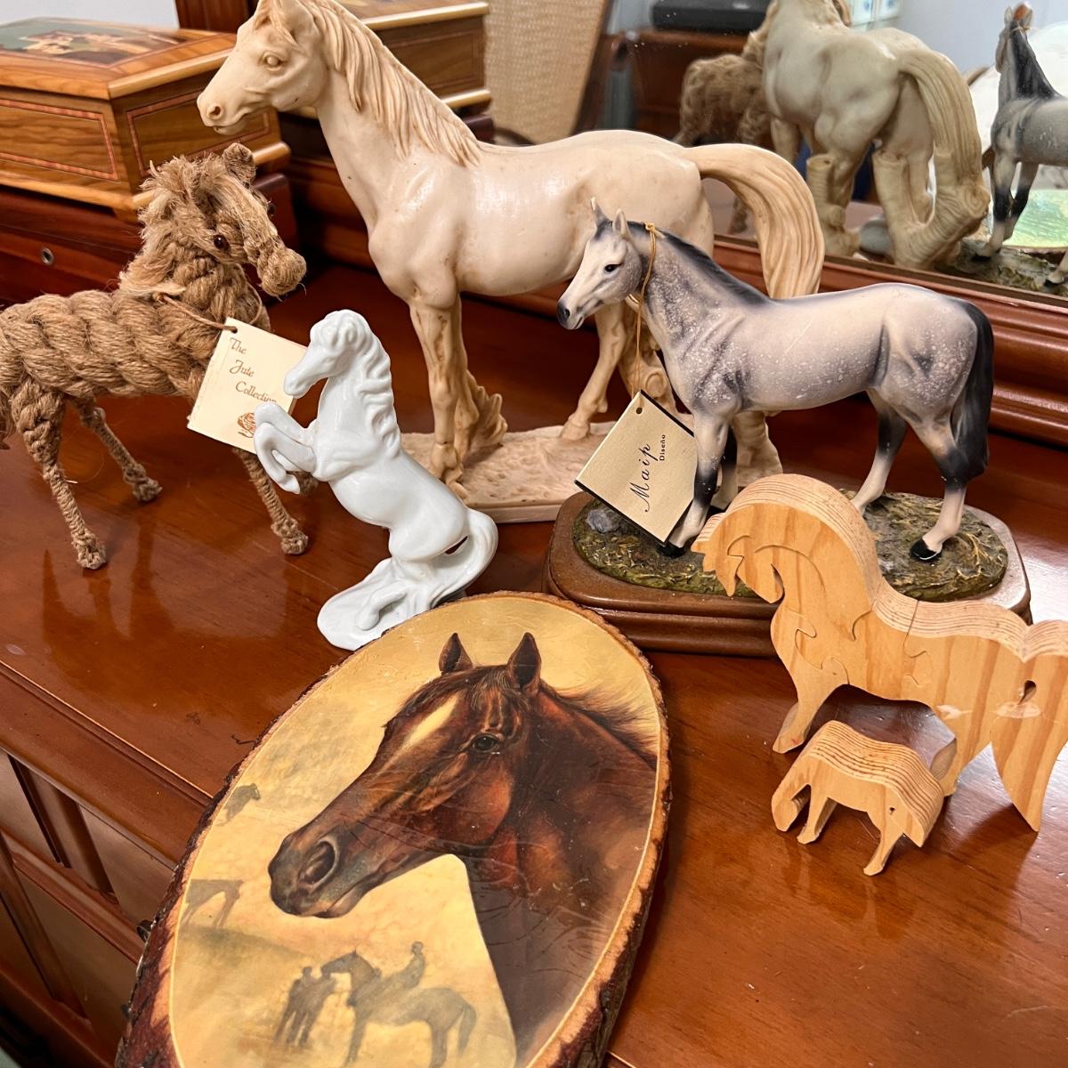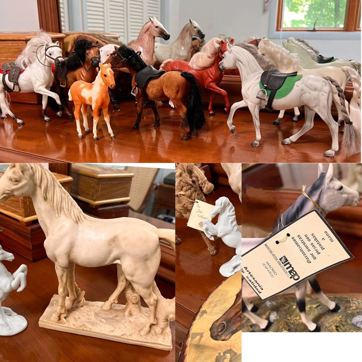 Lot of vintage horses. Toys with some stamped with GC - Empire Grand Champion (plus accessories). New with tags porcelain figurine from Madrid Spain. Hand braided new with tags horse. Wooden horse with foal puzzle. Very interesting collection!