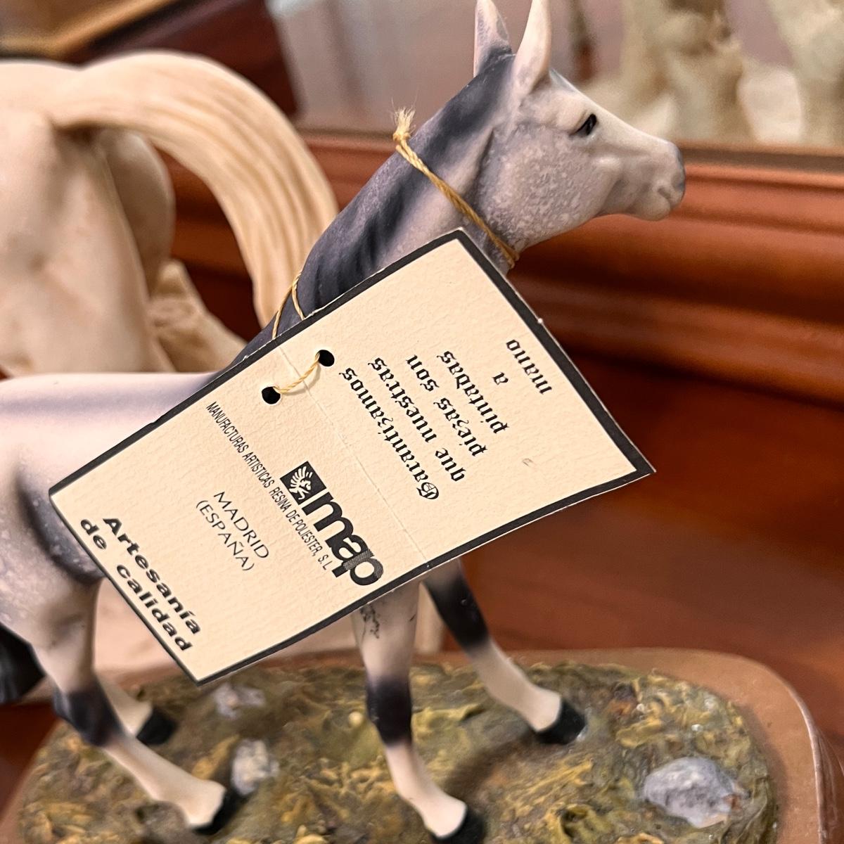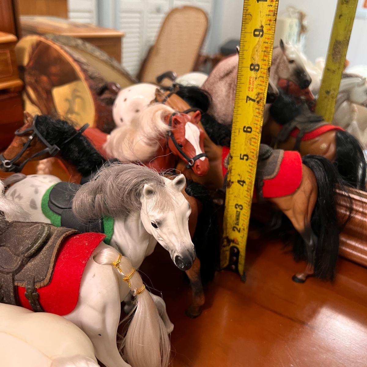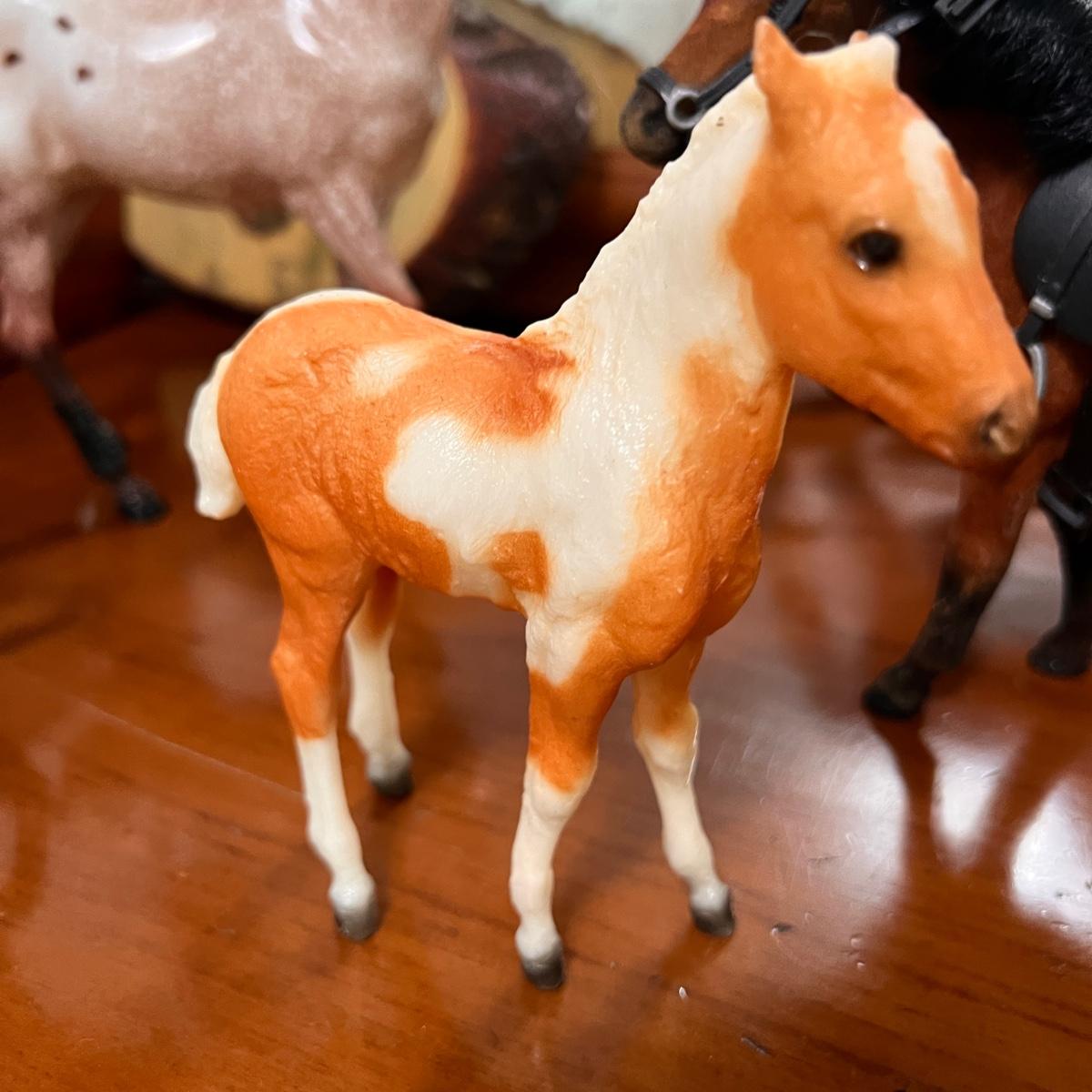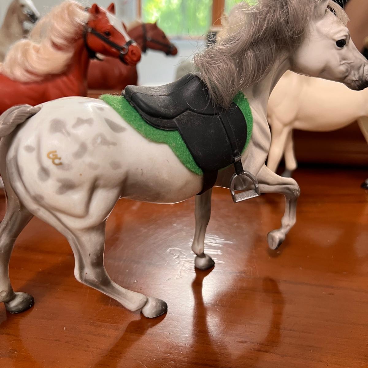 Lot of vintage horses. Toys with some stamped with GC - Empire Grand Champion (plus accessories). New with tags porcelain figurine from Madrid Spain. Hand braided new with tags horse. Wooden horse with foal puzzle. Very interesting collection!