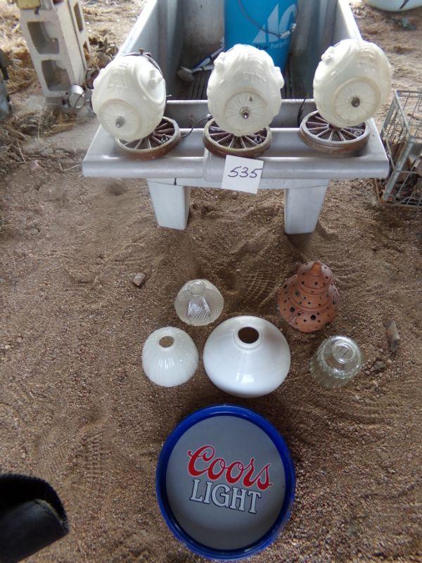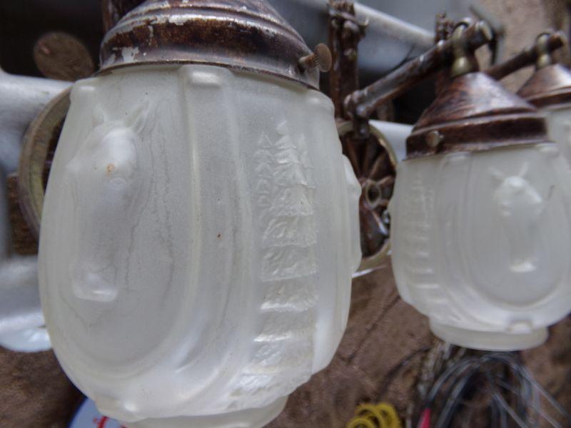 VINTAGE LIGHT COVERS. THESE COVERS ARE IN GOOD CONDITION. THE 3 MATCHING LIGHT FIXTURES HAVE HORSES ON THE GLASS GLOBE AND WAGON WHEEL MOUNT. THERE IS ALSO A BULL ON THE TOP OF THE FIXTURE.