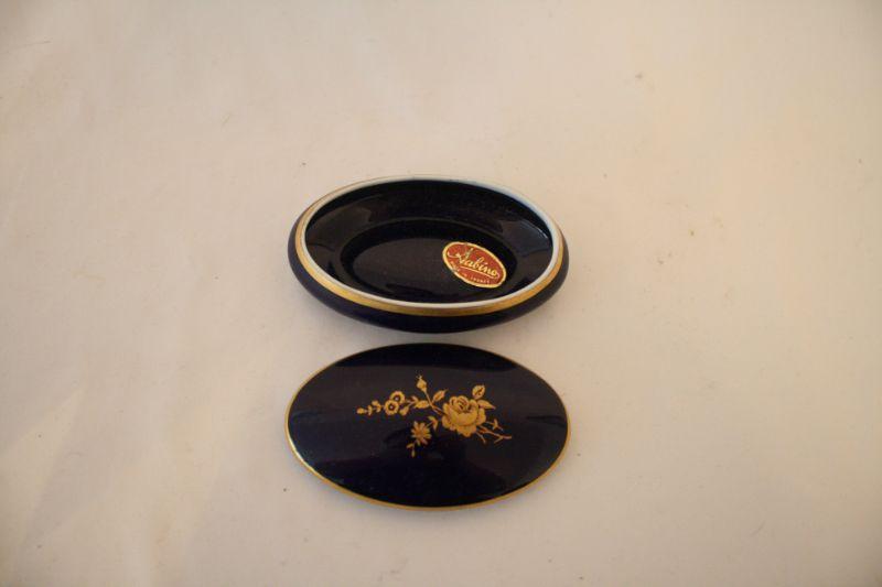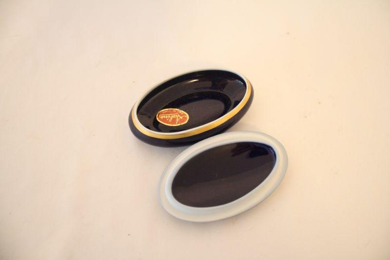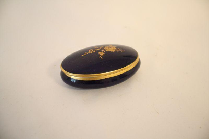 Vintage Limoges Veritable Blue De Four Trinket Box - Small porcelain trinket box featuring a cobalt blue and gold design. Made by Limoges France. Measures about 4.5" inches long.