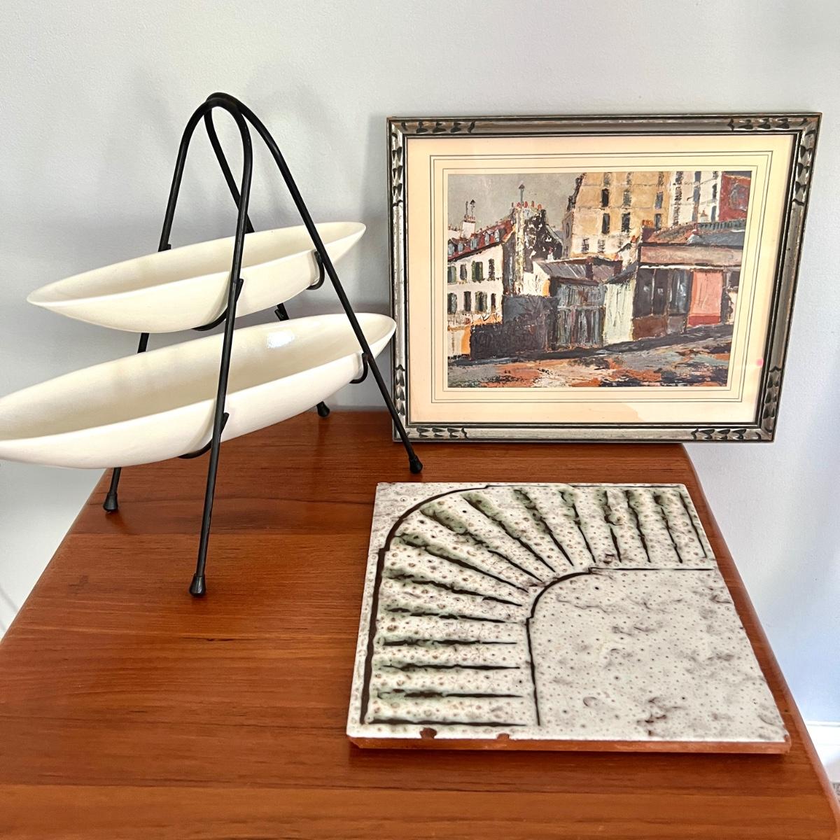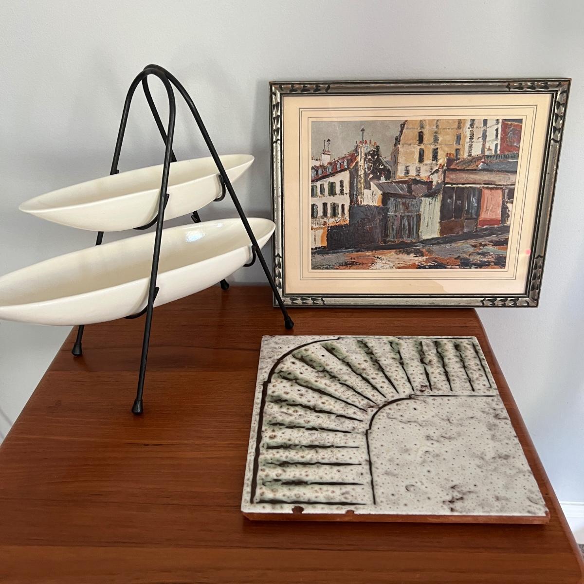 Italian tile/hot plate, 2 tier oblong bowl set, framed print.