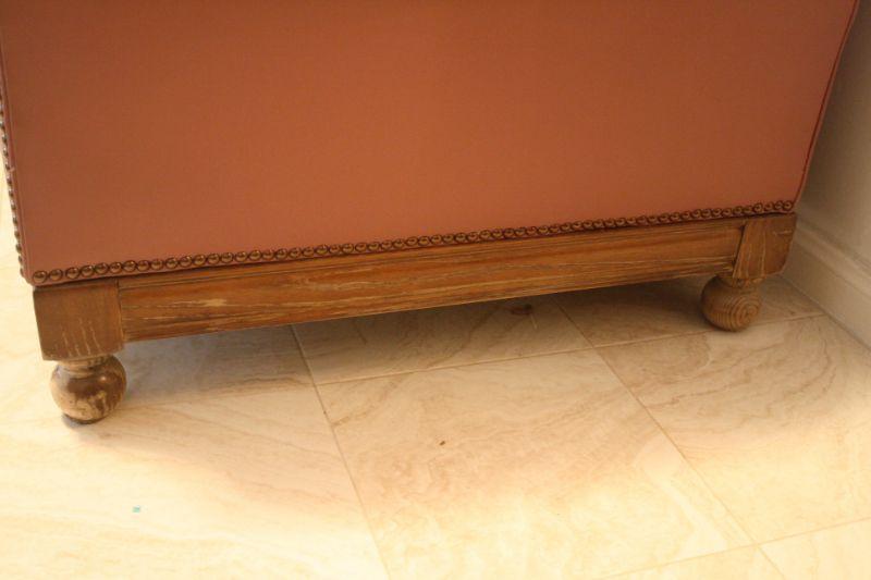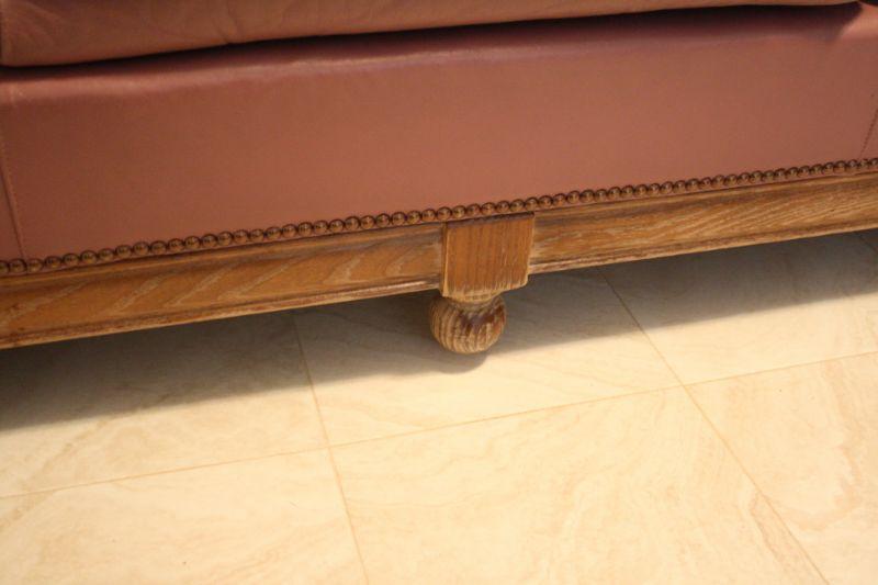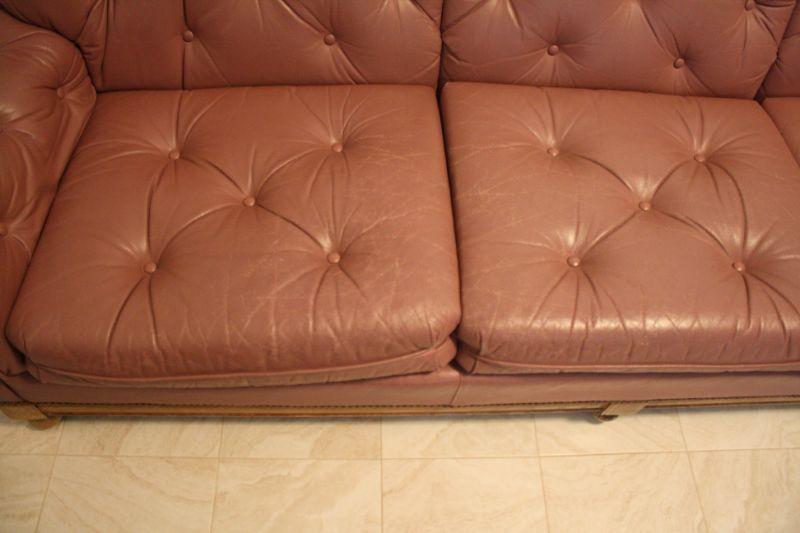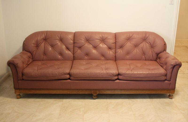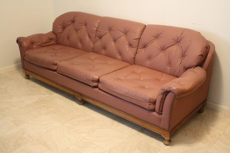 Lot #31: Vintage Mauve-Pink Leather Tufted Sofa with Wooden Knob Legs