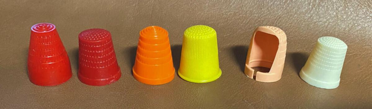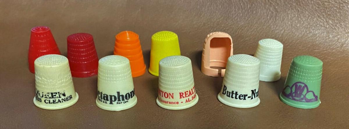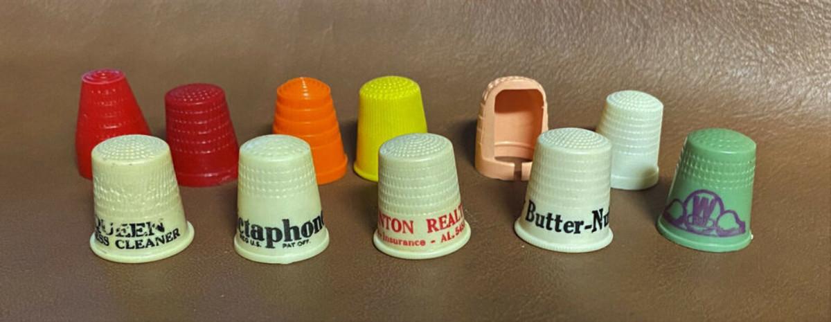 eleven plastic sewing thimbles with five with advertising...Good condition...BUTTER-NUT THE COFFEE DELICIOUS..FILTER QUEEN AMERICA'S BAGLESS CLEANER(imprint wear)..W..DICTAPHONE..V.J. DUNTON REALTY CO. DENVER..6 BLANK.