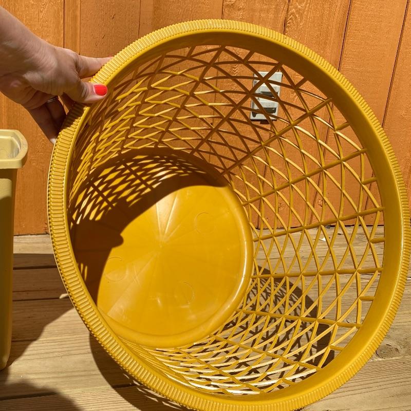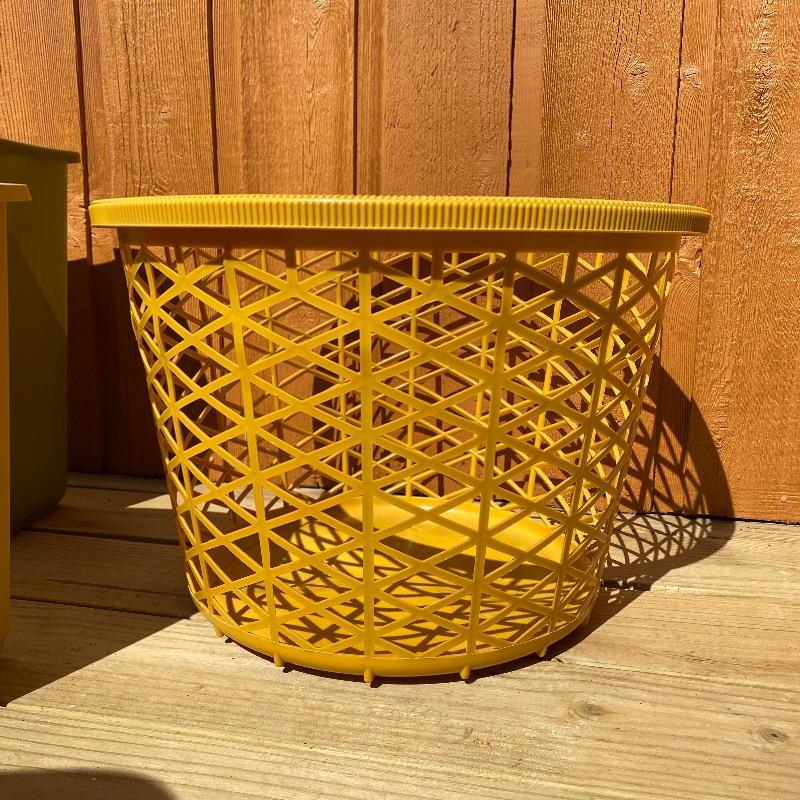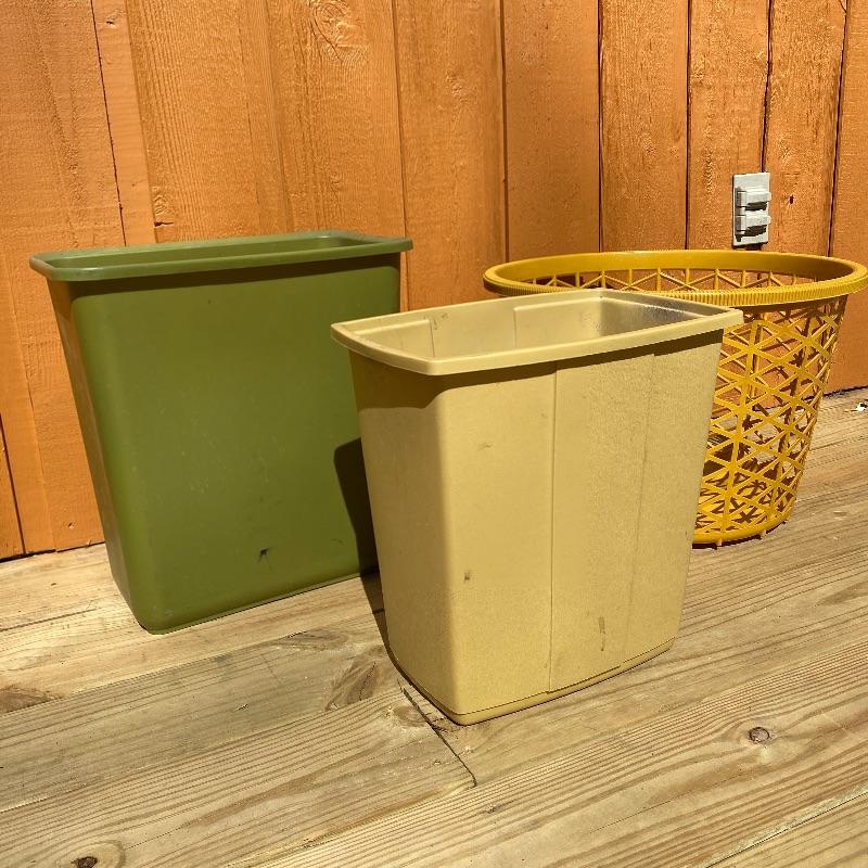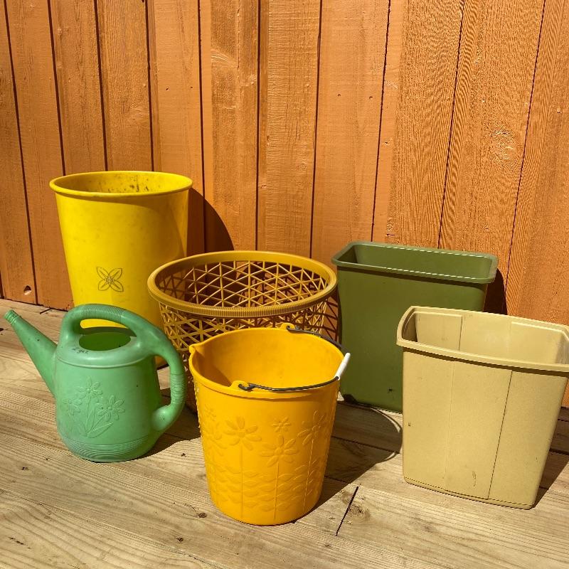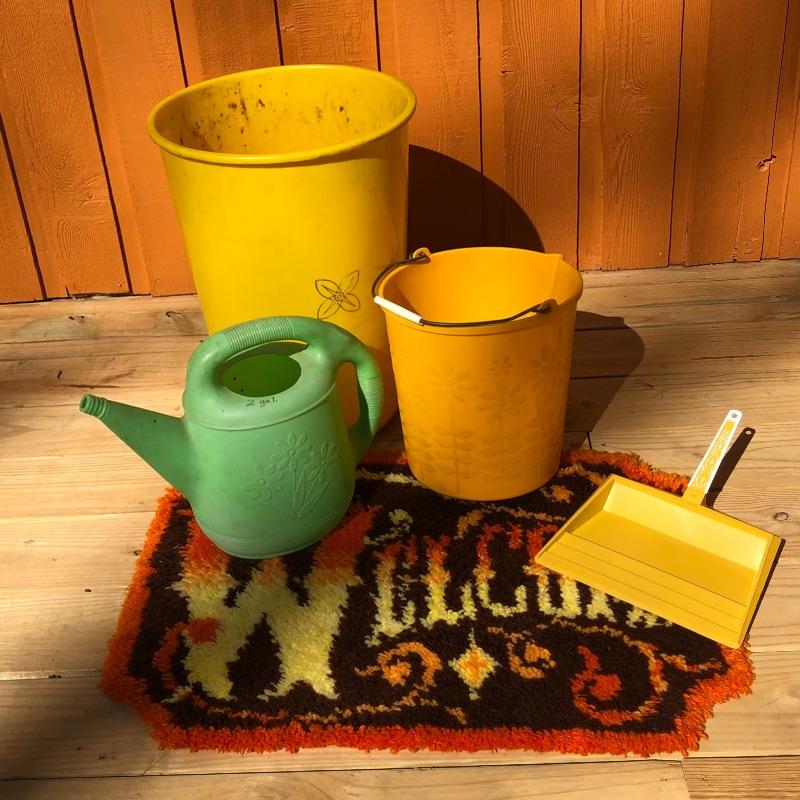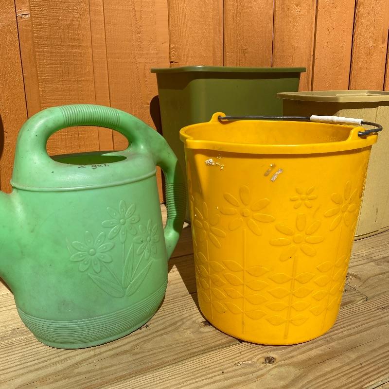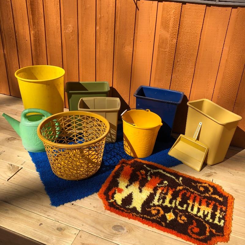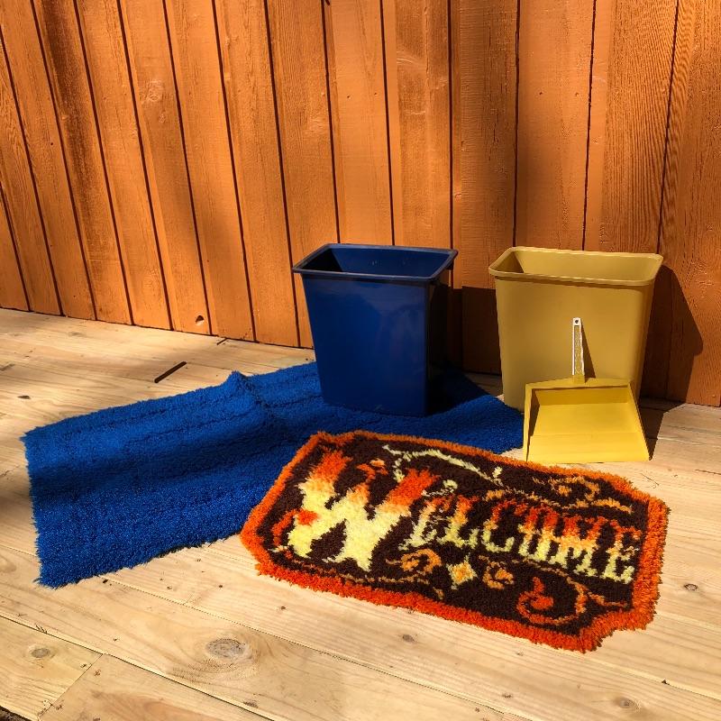 Colorful home essentials to brighten up your laundry. Lot includes floral motif yellow bucket and green watering can which has “2 gal.” written in ink on rim. Large yellow and medium woven laundry baskets. Both have crack (see photos). Two light green trash cans with no floral detail. Also includes a blue trash can and blue bath mat, bath mat has mild yellowing on the back. Lastly, a “Welcome” latch hook rug. No shipping.