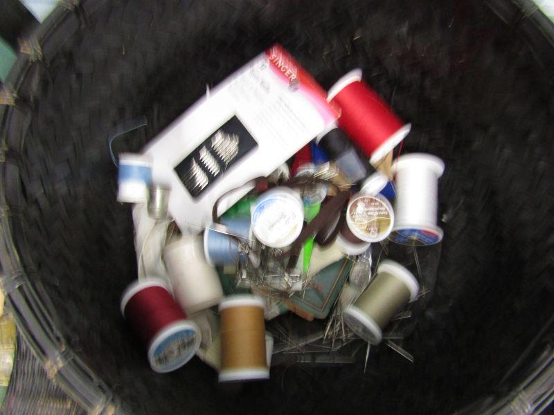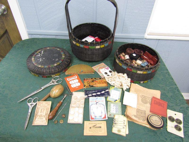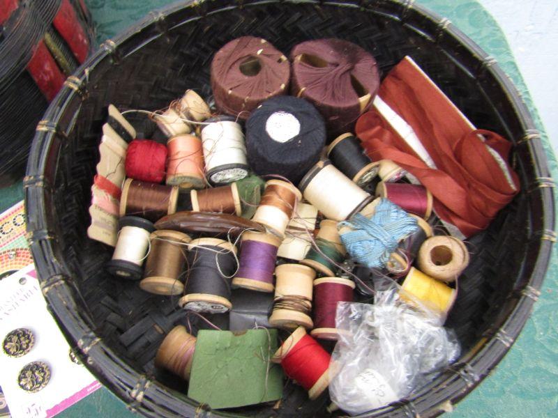 LOT 75 VINTAGE STACKING BASKET W/VINTAGE SEWING NOTIONS