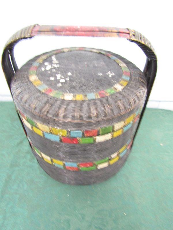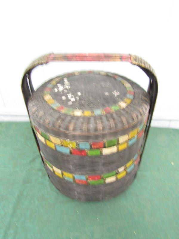 LOT 75  VINTAGE STACKING BASKET W/VINTAGE SEWING NOTIONS