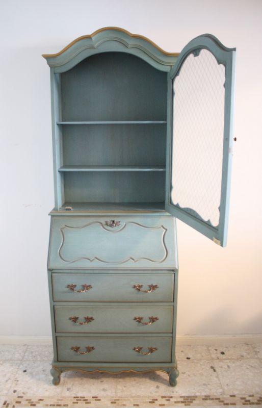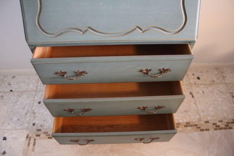 Vintage Teal Jasper Cabinet Style Chippendale Secretary Hutch - This beautifully crafted light teal colored hutch/cabinet has three pull out drawers, a pull out secretary style desk with three small shelves and six small drawers. It also has a glass door that opens to two shelves. In excellent condition, with the exception of a small red marking shown in photo. Measures 27.5" (width) 16" (depth) 74" (height).