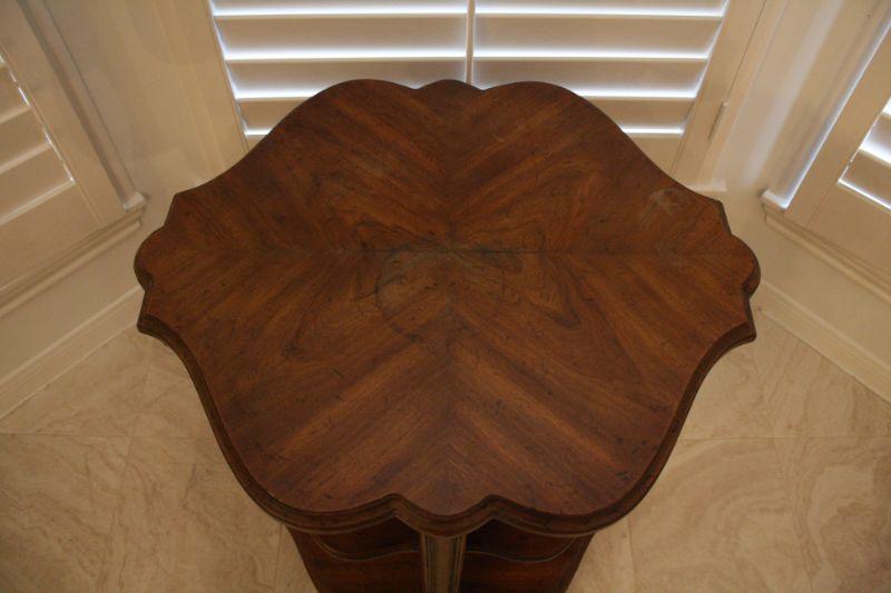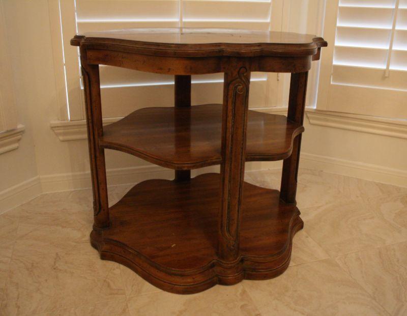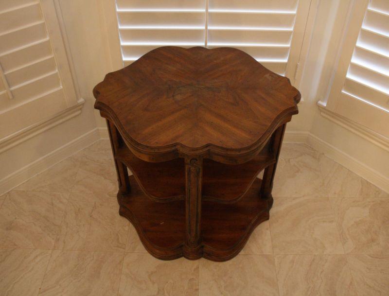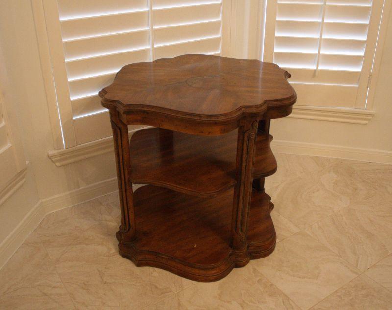Vintage Tiered Oak Side Table with Carved Pillars - This solid oak table has three tiers to utilize for storage. Unique shape and carved edges. In good condition with exception of stains on the top. Measures 28" (width) 24" (depth) 25" (height).