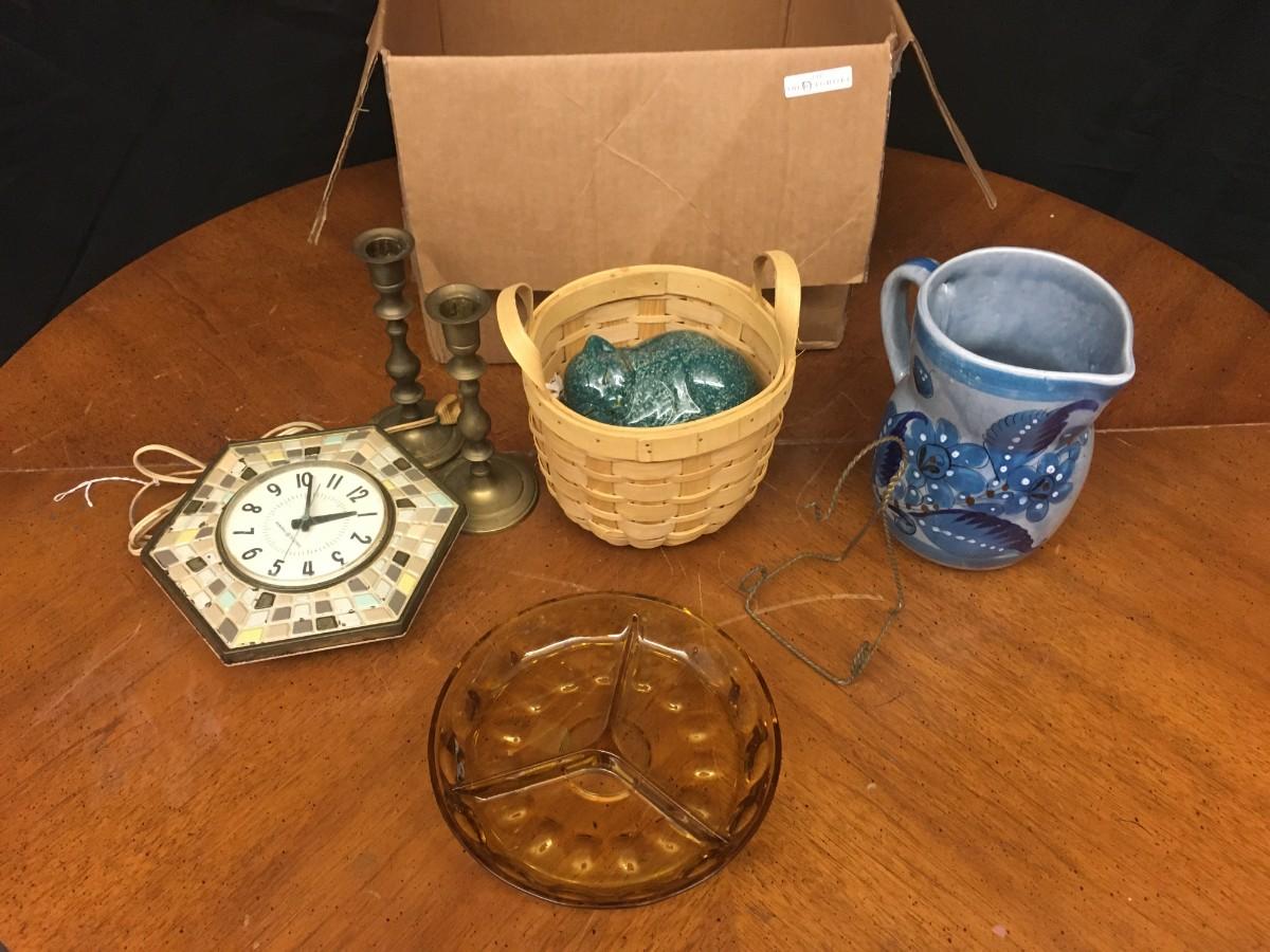 home decor:lot vintage wall clock (non working), vintage amber nut dish, sleeping cat figurine, Longaberger basket, blue pottery pitcher, 2 brass candlesticks;