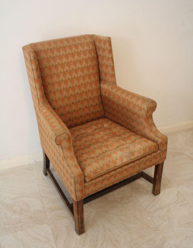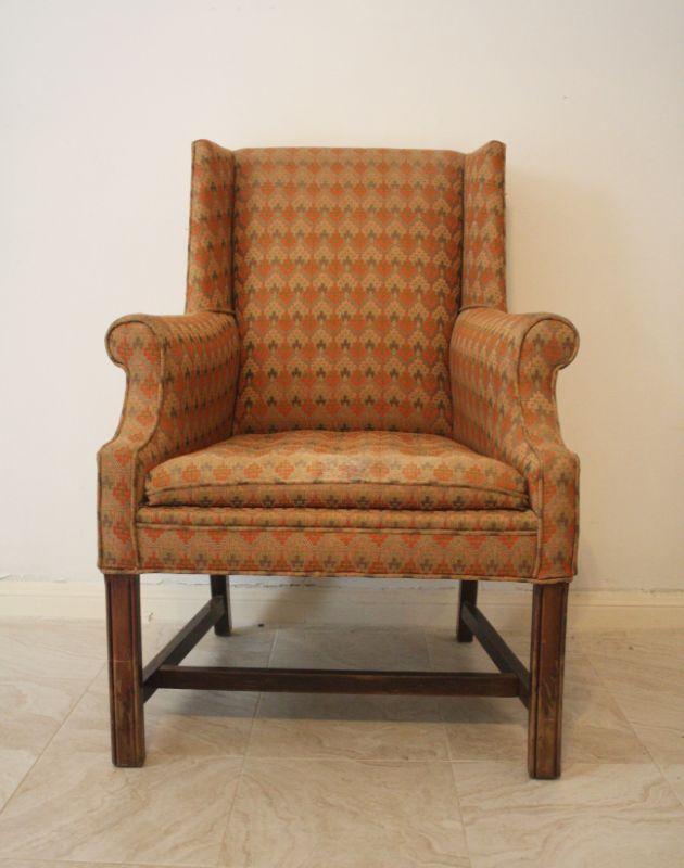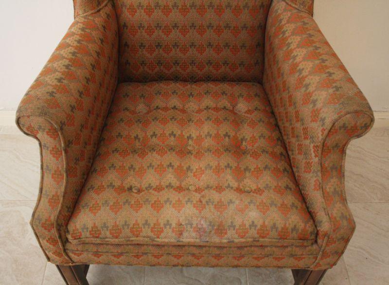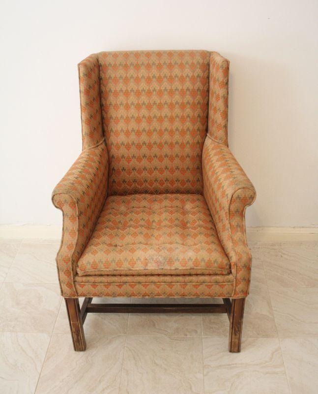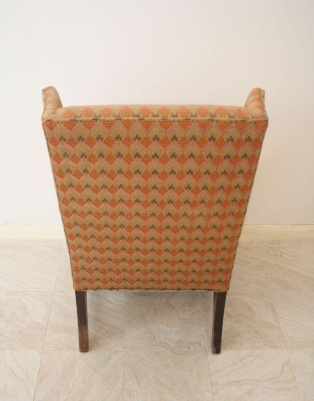 Vintage Orange Diamond Pattern Wingback Armchair - Great chair for office or study room. Fabric in excellent condition, legs are worn at the bottom. Measures: 26" (width) 25" (depth) 39" (height).