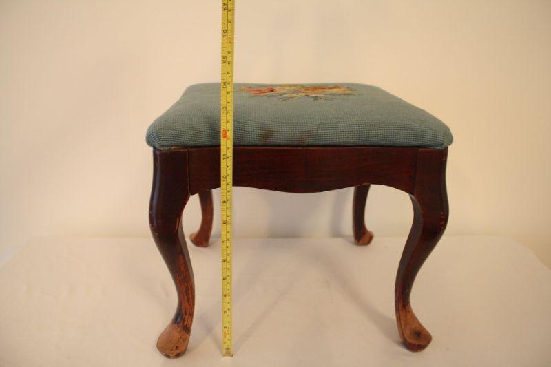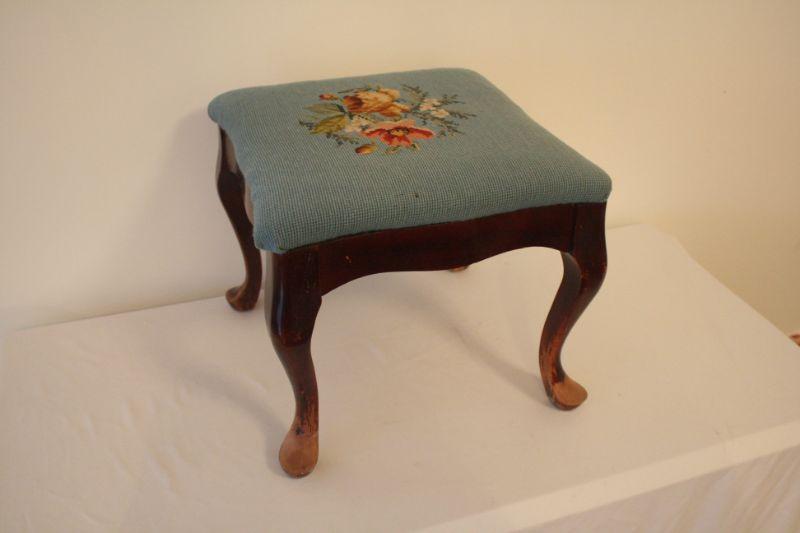 Vintage/Antique Embroidered Needle Point Turquoise Foot Stool - Vintage foot stool with original needlepoint upholstery. Fabric has some wear and wooden legs are faded at the bottom.