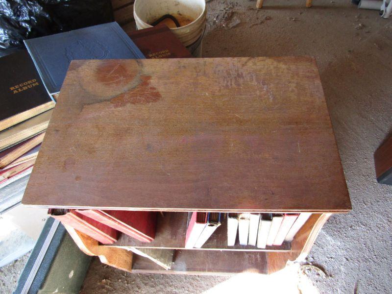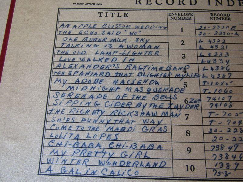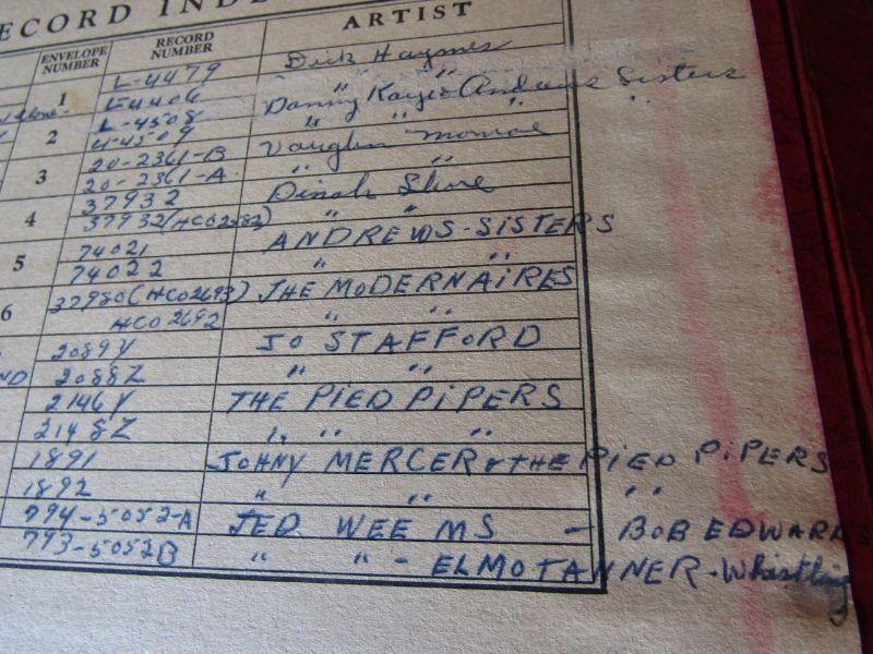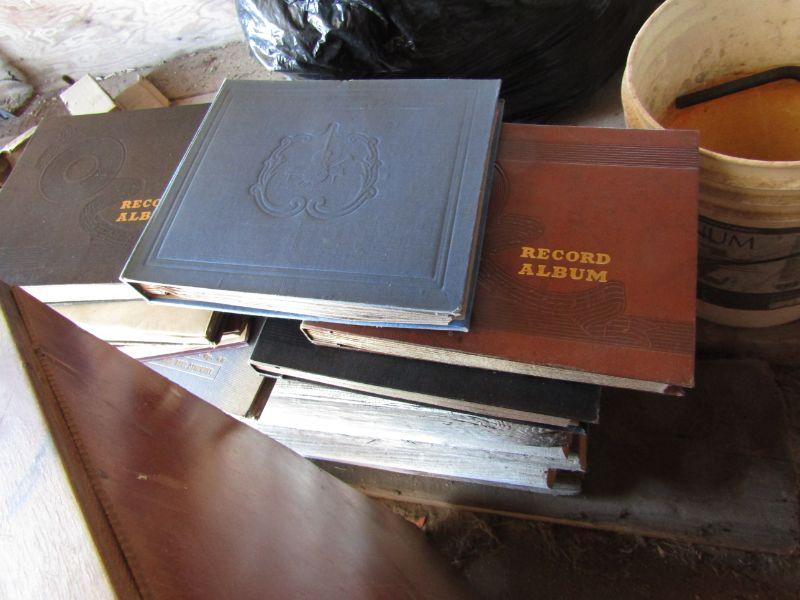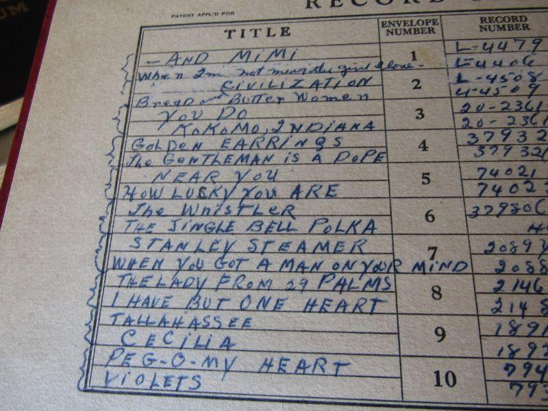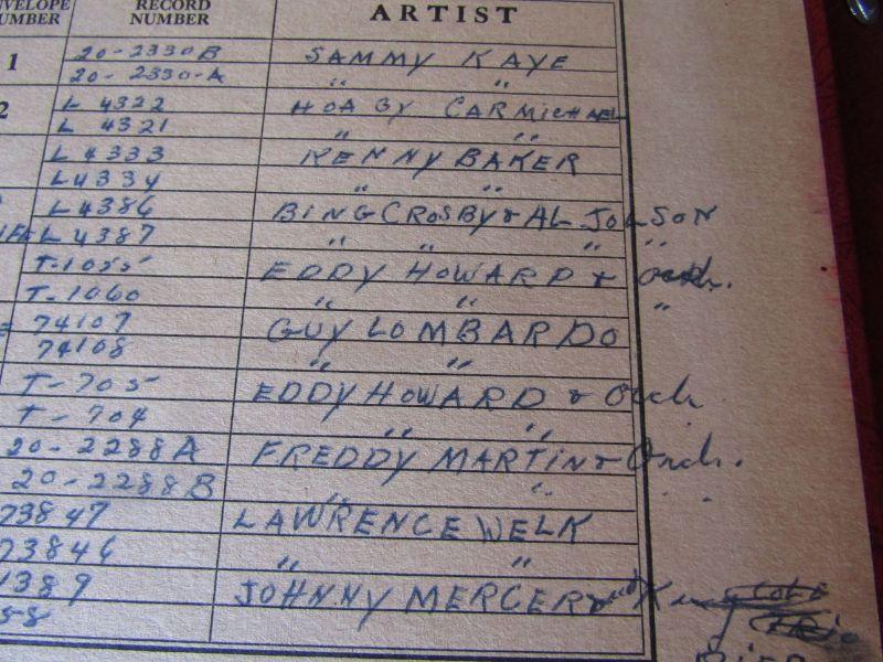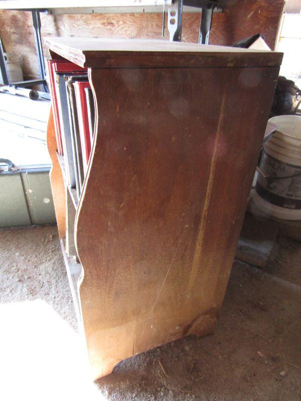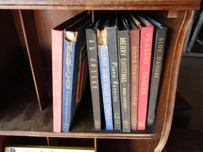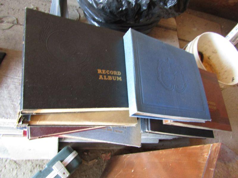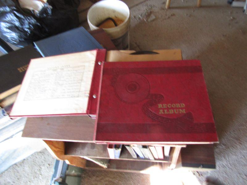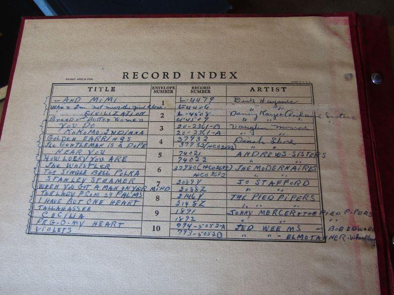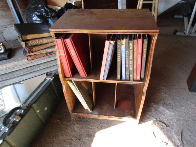 LARGE COLLECTION OF VINYL RECORDS, WOODEN MEDIA STAND, NICE COLLECTION OF BOUND VINYL RECORD ALBUMS WITH HANDWRITTEN INDEX OF EACH TITLE, RECORD NUMBER, ENVELOPE, AND ARTIST