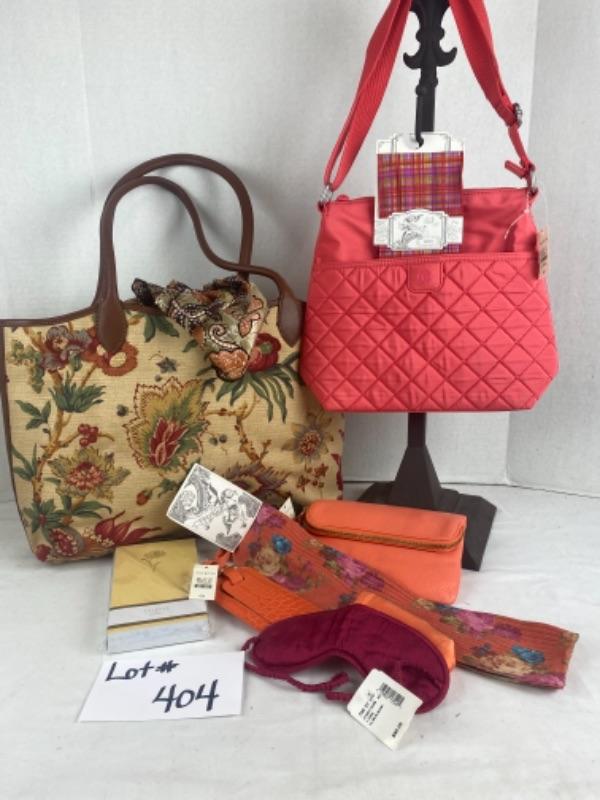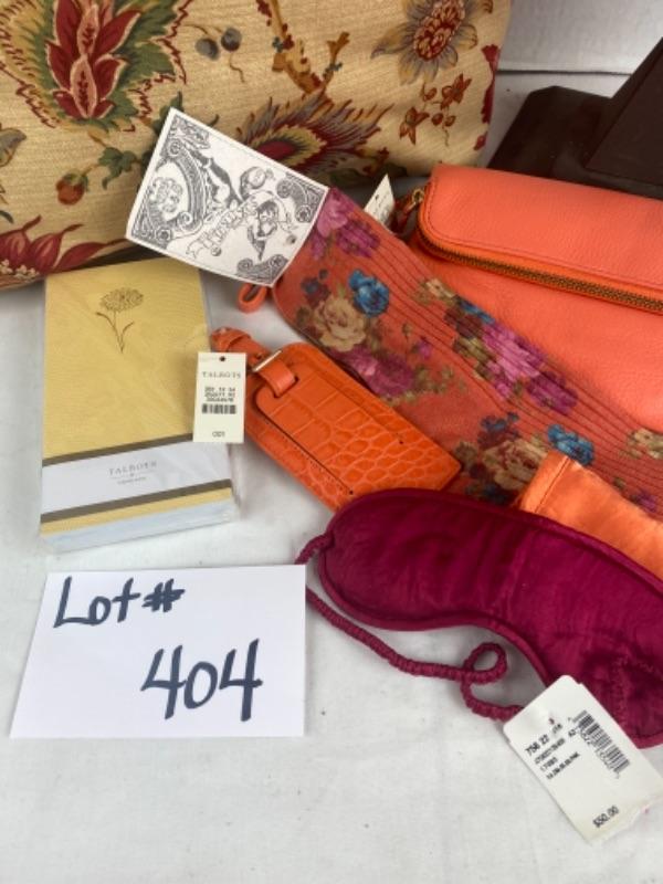 Talbots brown and tan flower shoulder bag, Talbots Coral shoulder bag , Basha silk scarf, Talbots by Crane Greeting Card set, Talbots orange leather clutch purse, pair of socks and sleep mask