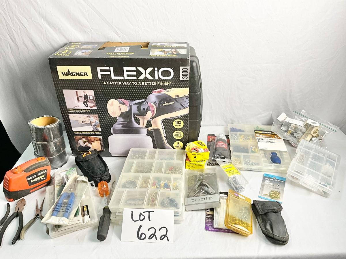 Lot W 622 NIB FLEXiO Paint Sprayer, Picture Hanger Kits, Various Small Tools and more
