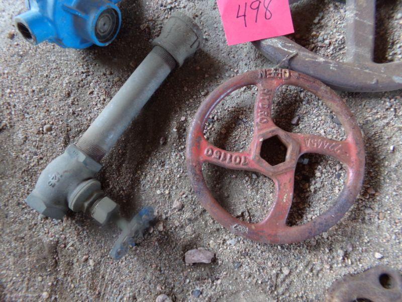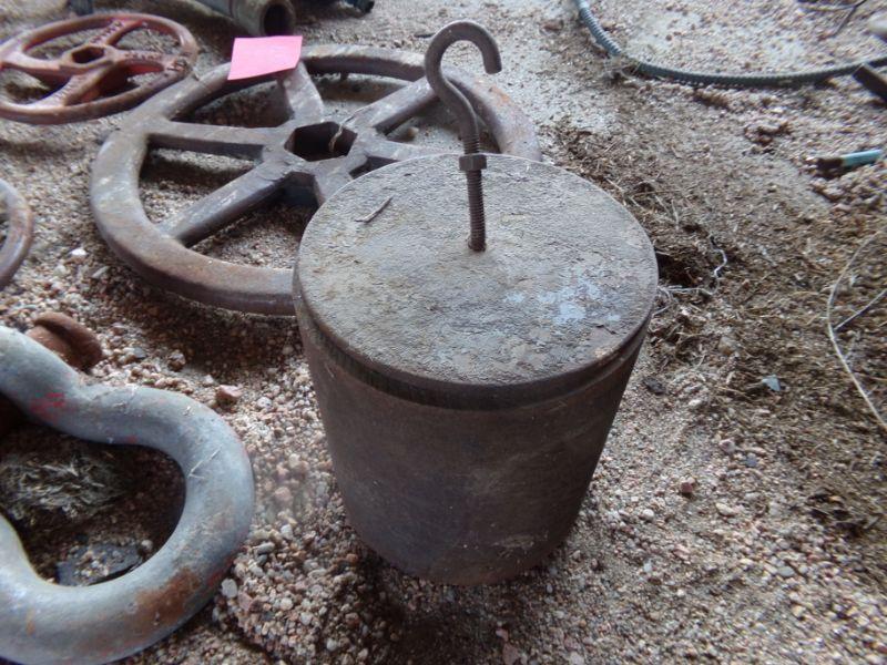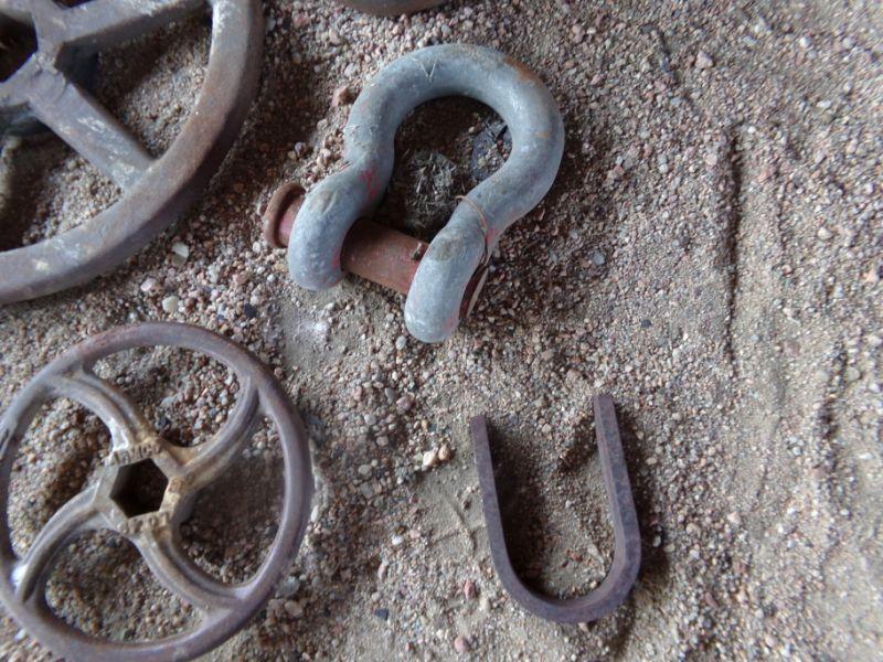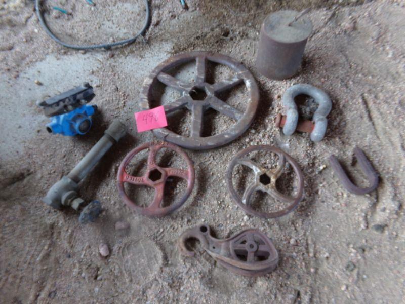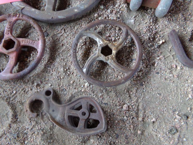 SEVERAL WATER VALVE WHEELS, A WEIGHT AND OTHER FARM ITEMS.