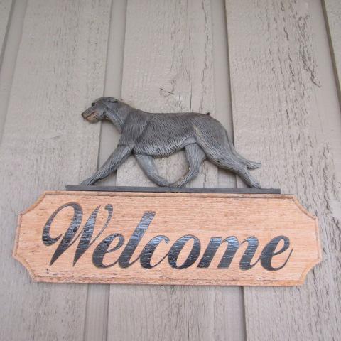 LOT 81 WELCOME SIGN WITH IRON IRISH WOLFHOUND