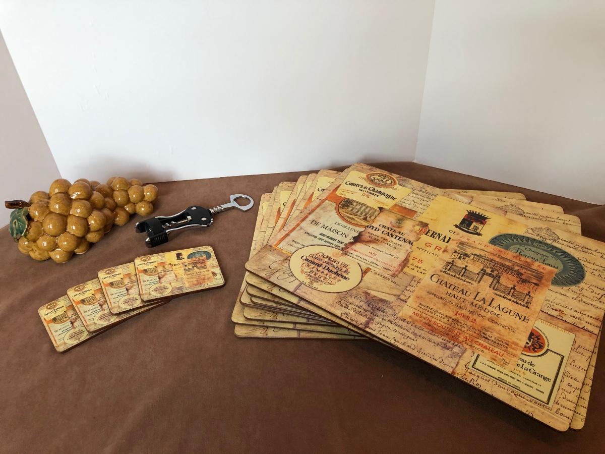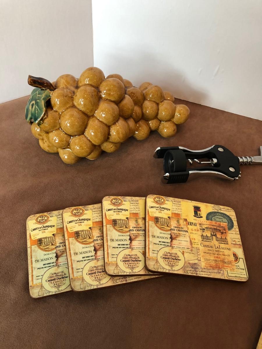 Includes handmade ceramic grapes and wine bottle opener in addition to 8 placemats and 4 coasters