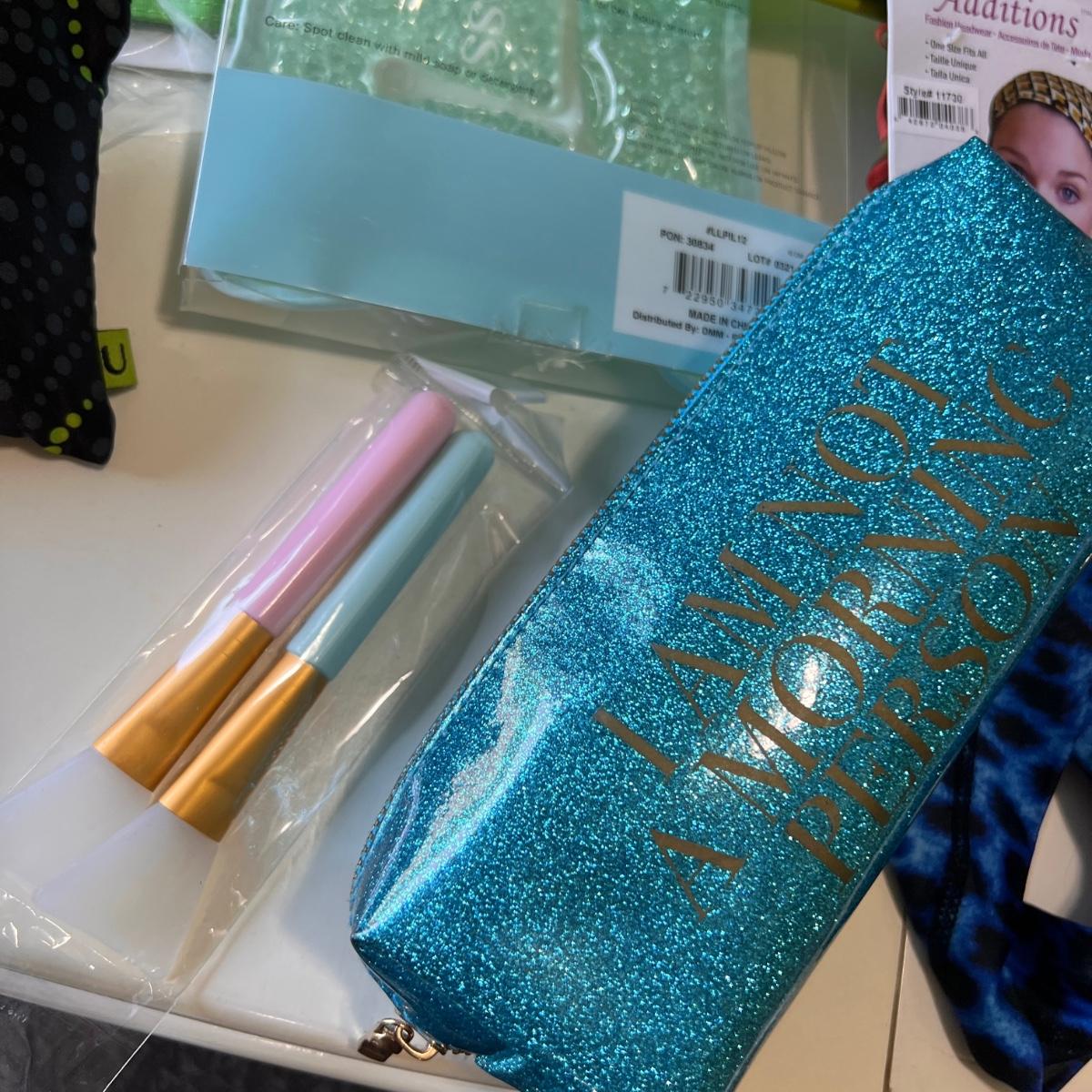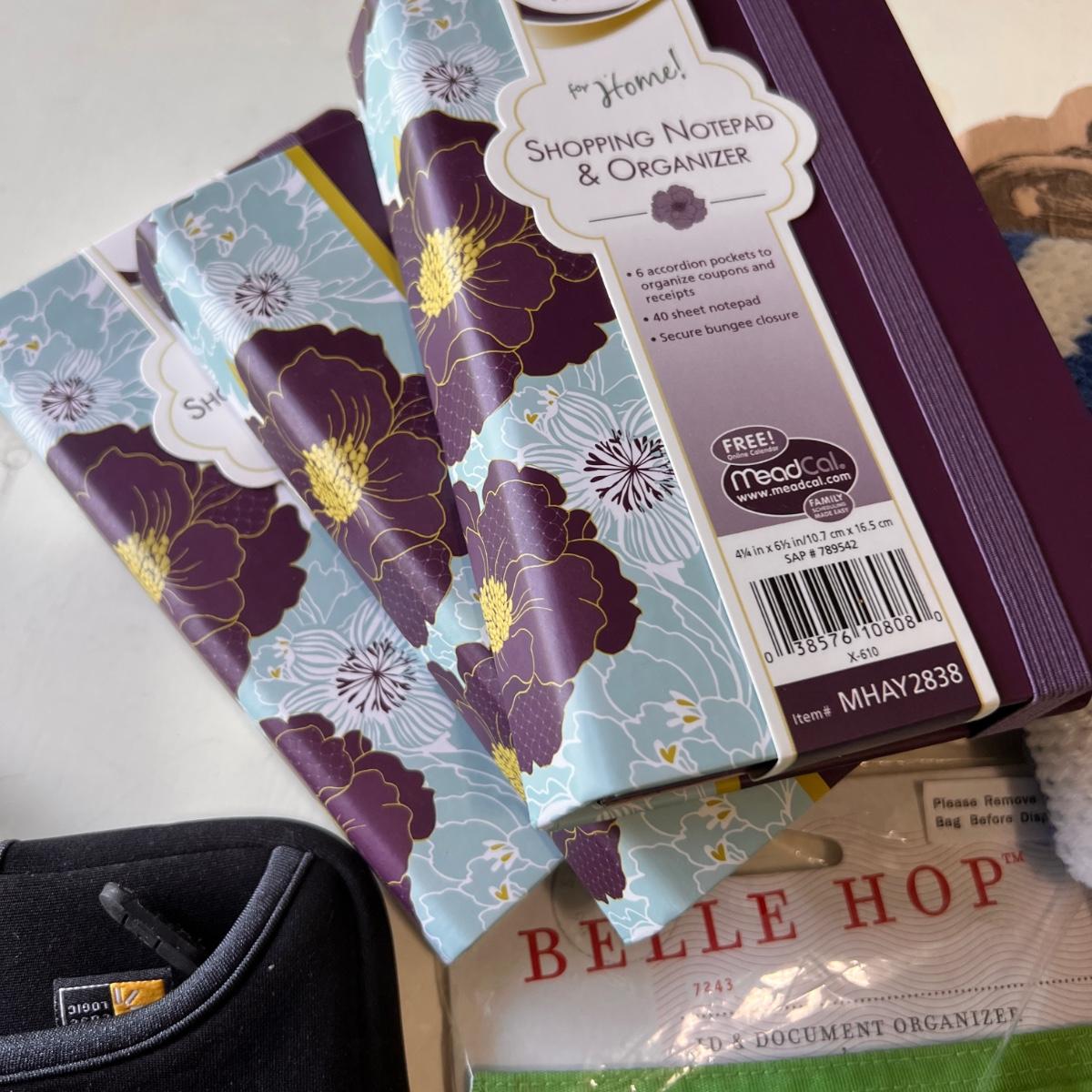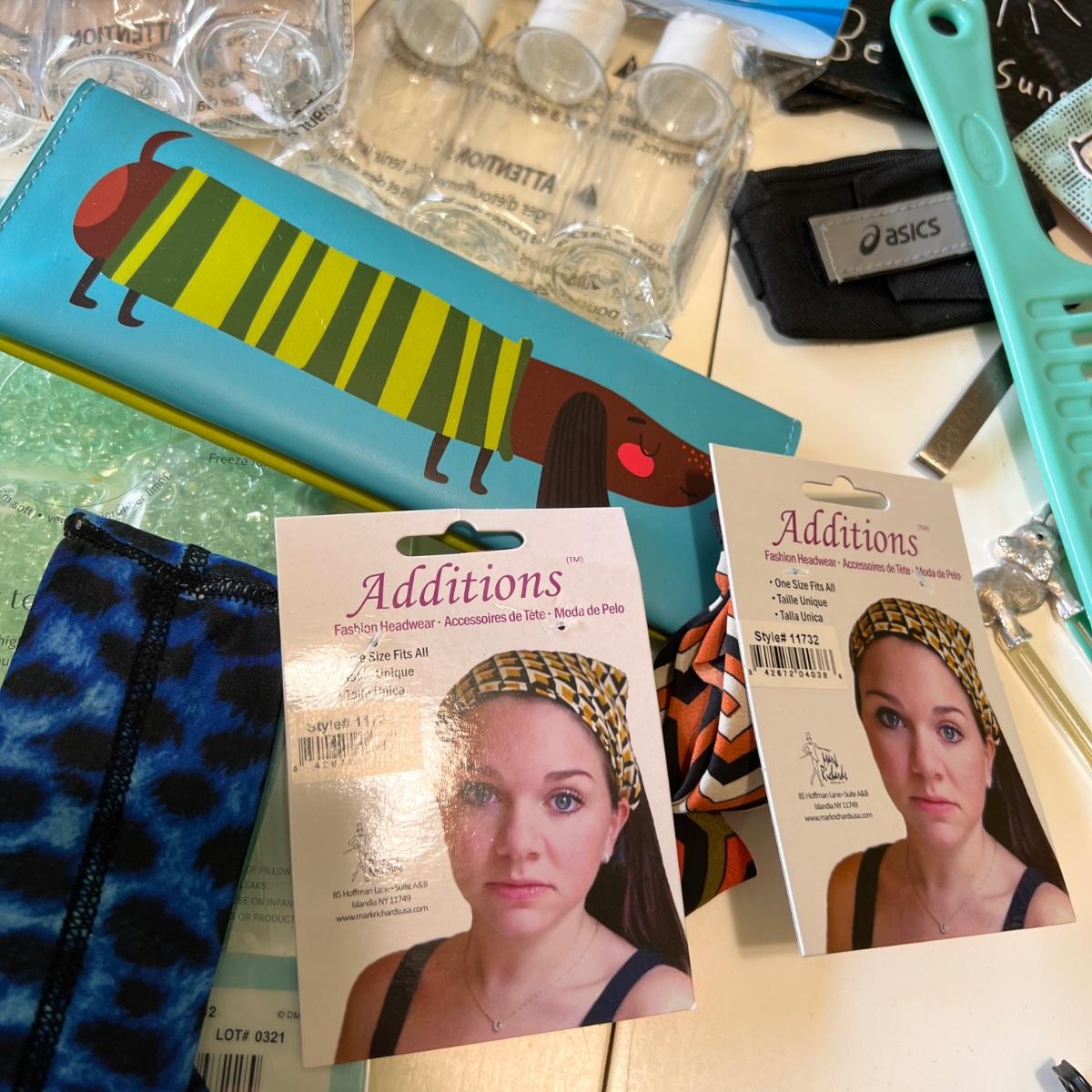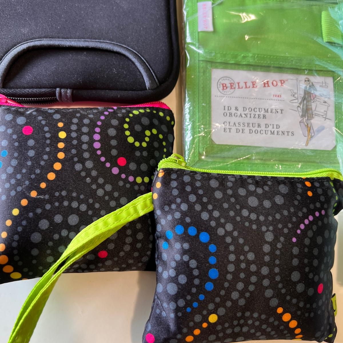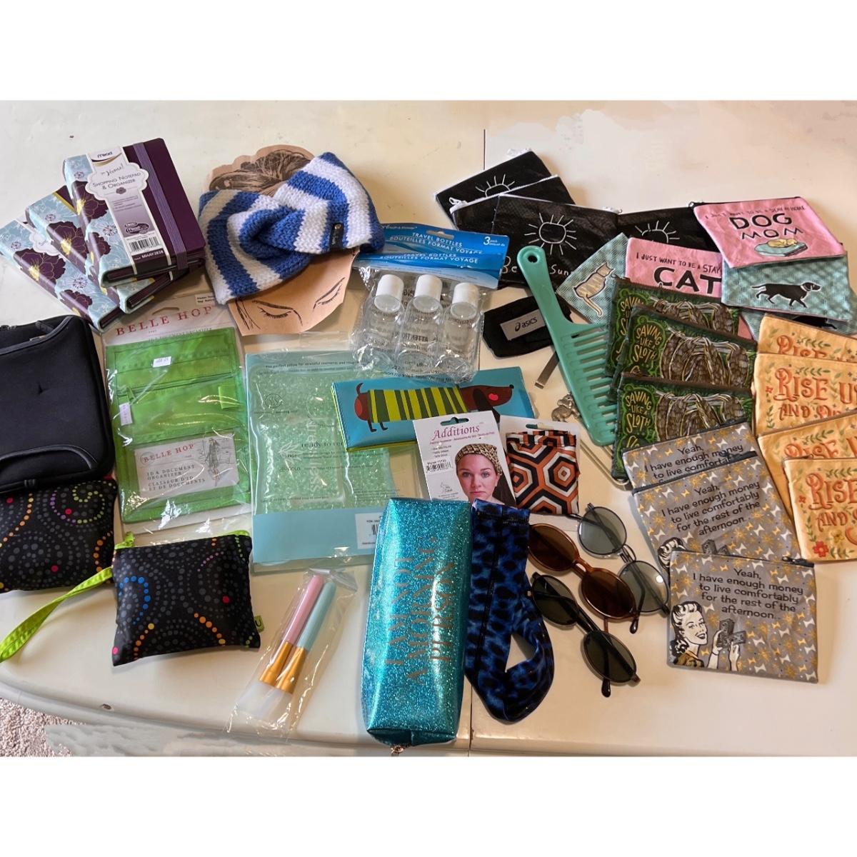 Multiple small decorative change purses, 2 fashion headbands, 1 knit headband ear warmer, 2 reusable bags, travel product bottles, sunglasses, organizers, shopping notepad and organizers plus more.