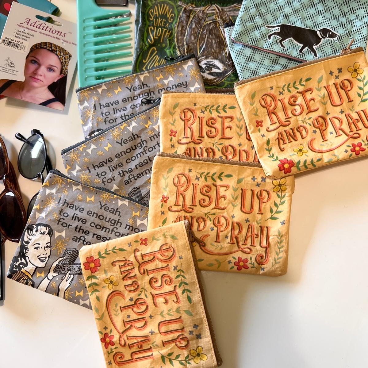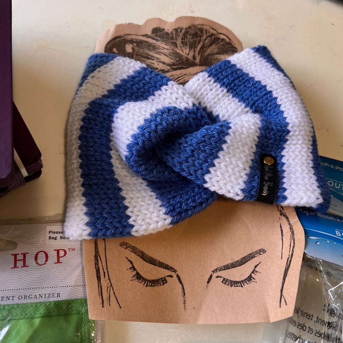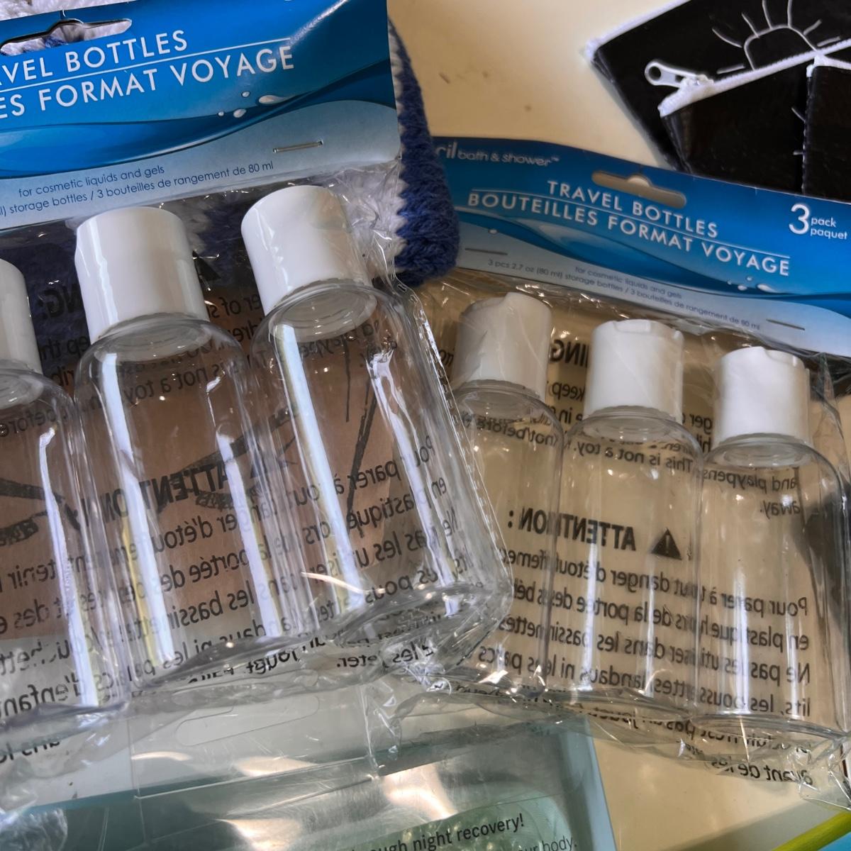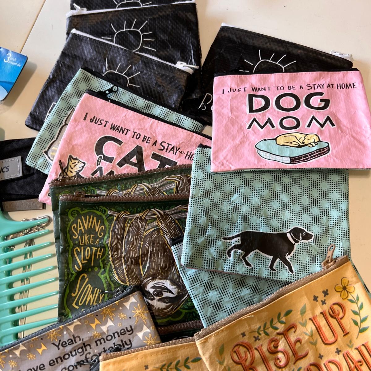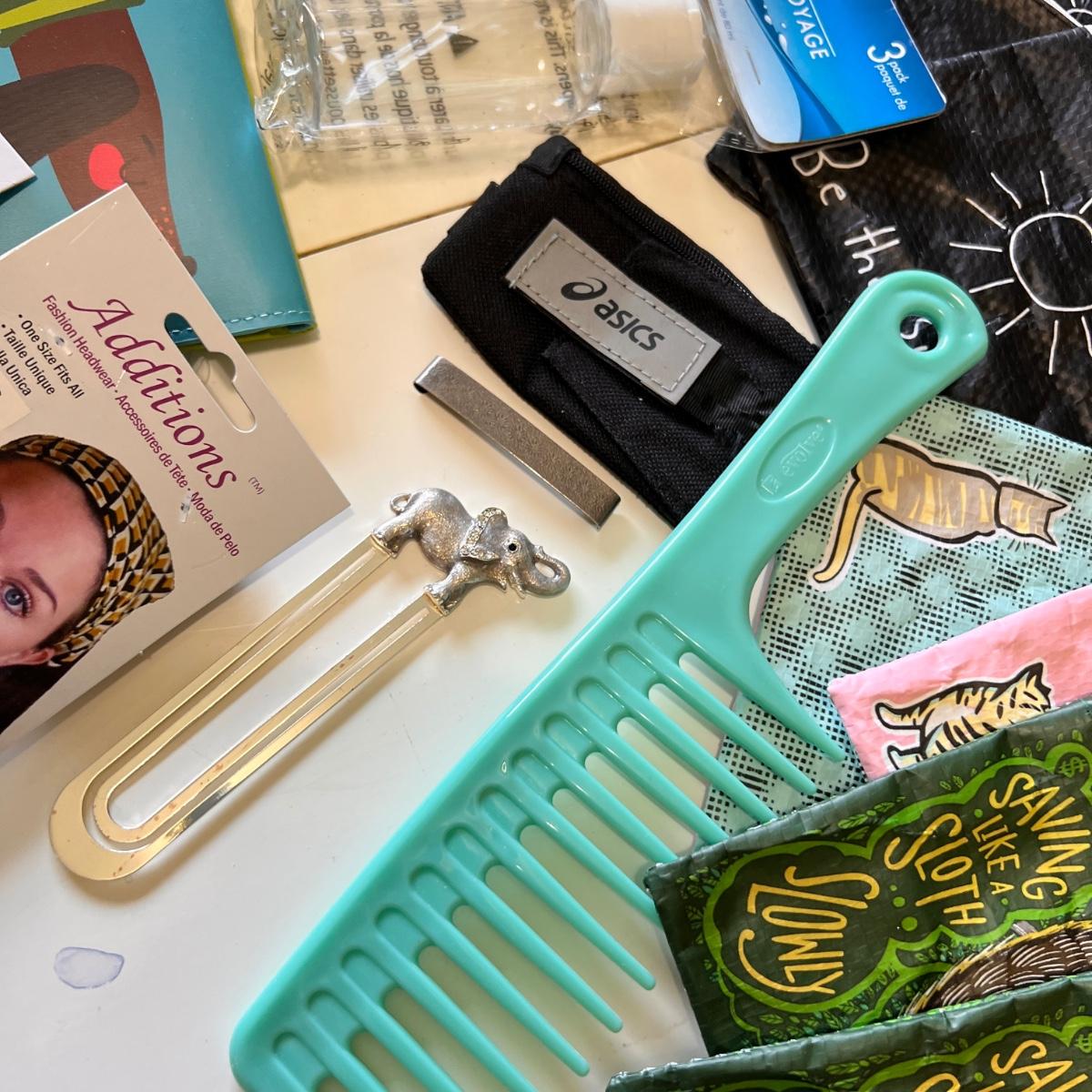 Multiple small decorative change purses, 2 fashion headbands, 1 knit headband ear warmer, 2 reusable bags, travel product bottles, sunglasses, organizers, shopping notepad and organizers plus more.