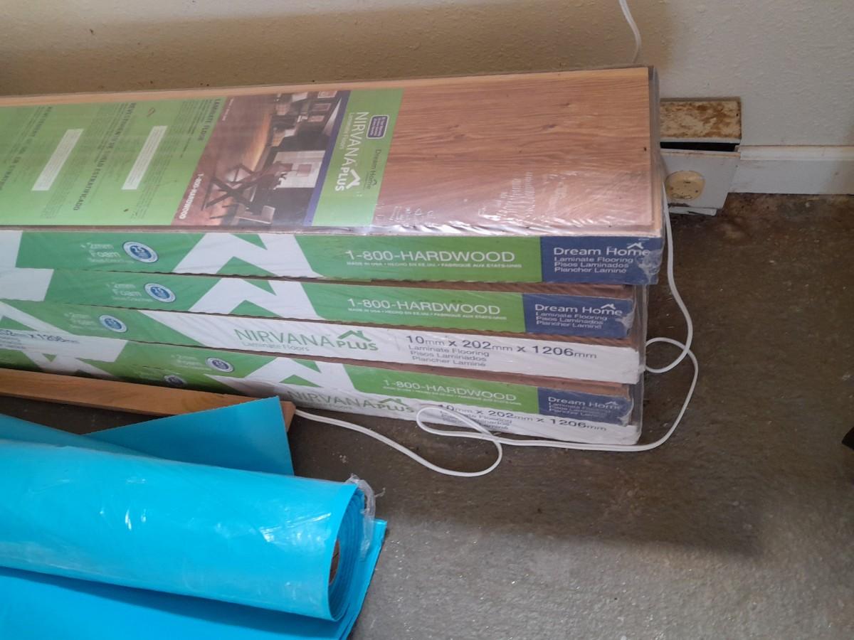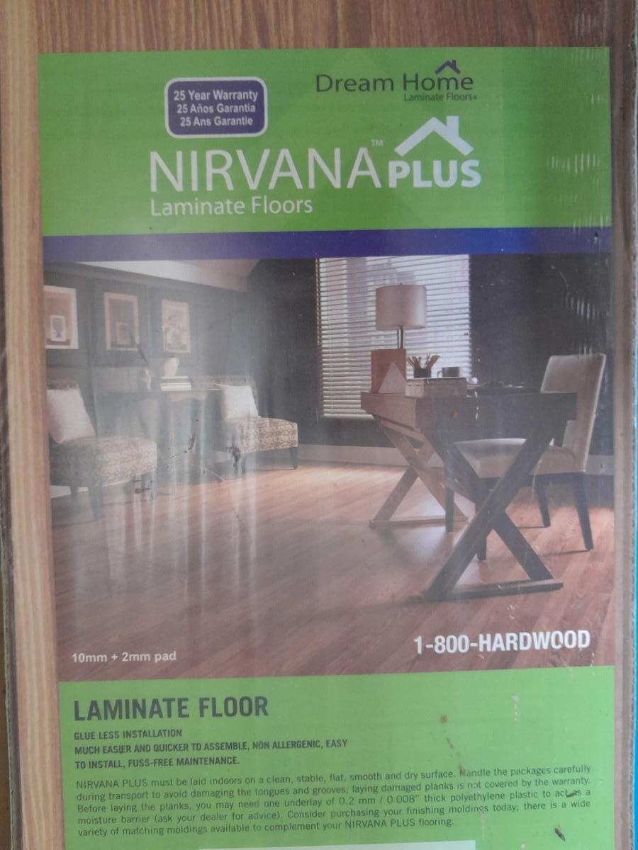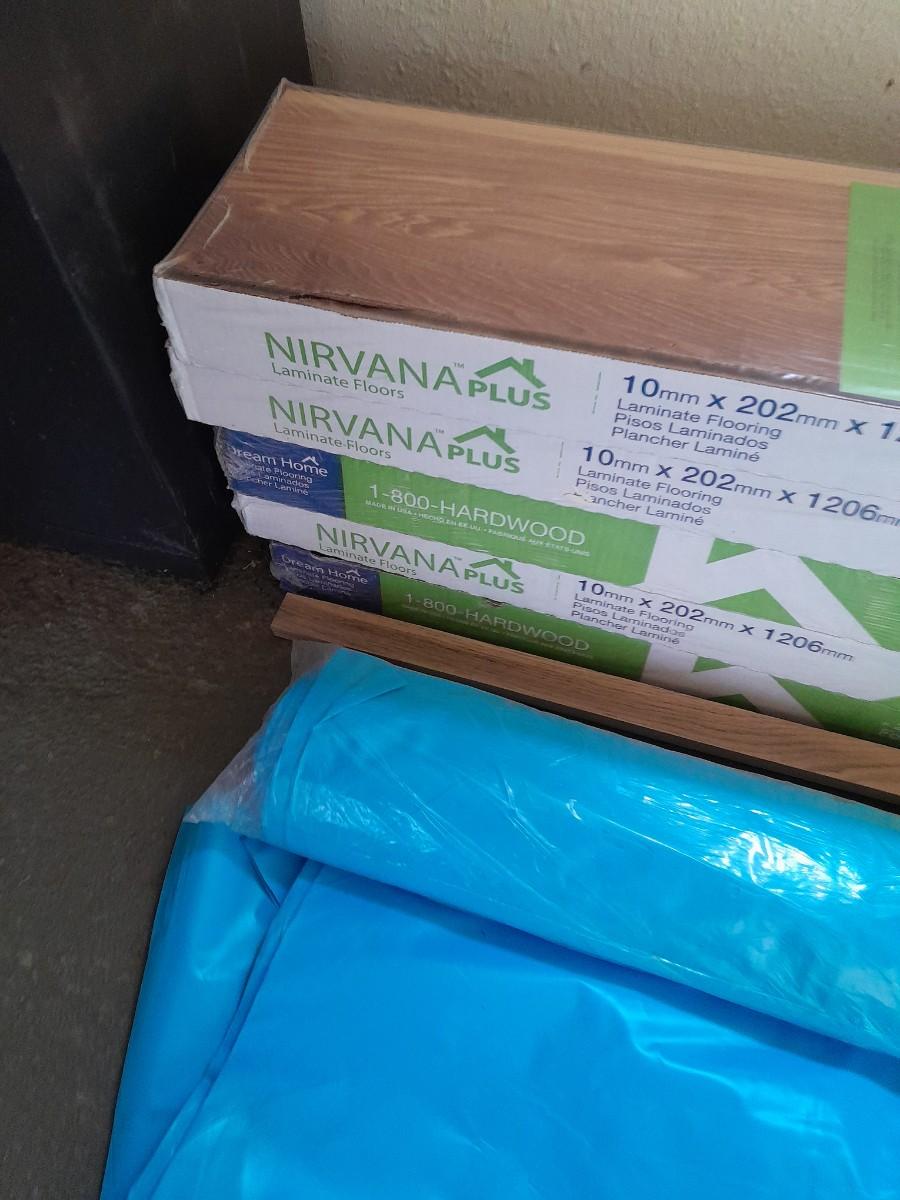 FOUR BOXES OF NIRVANA PLUS 10MM HARDWOOD LAMINATE FLOORING WITH PARTIAL ROLL OF UNDERLAYMENT.