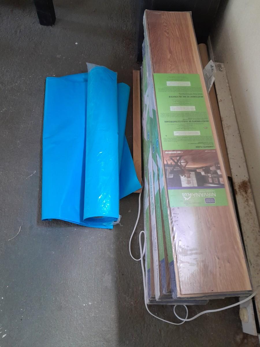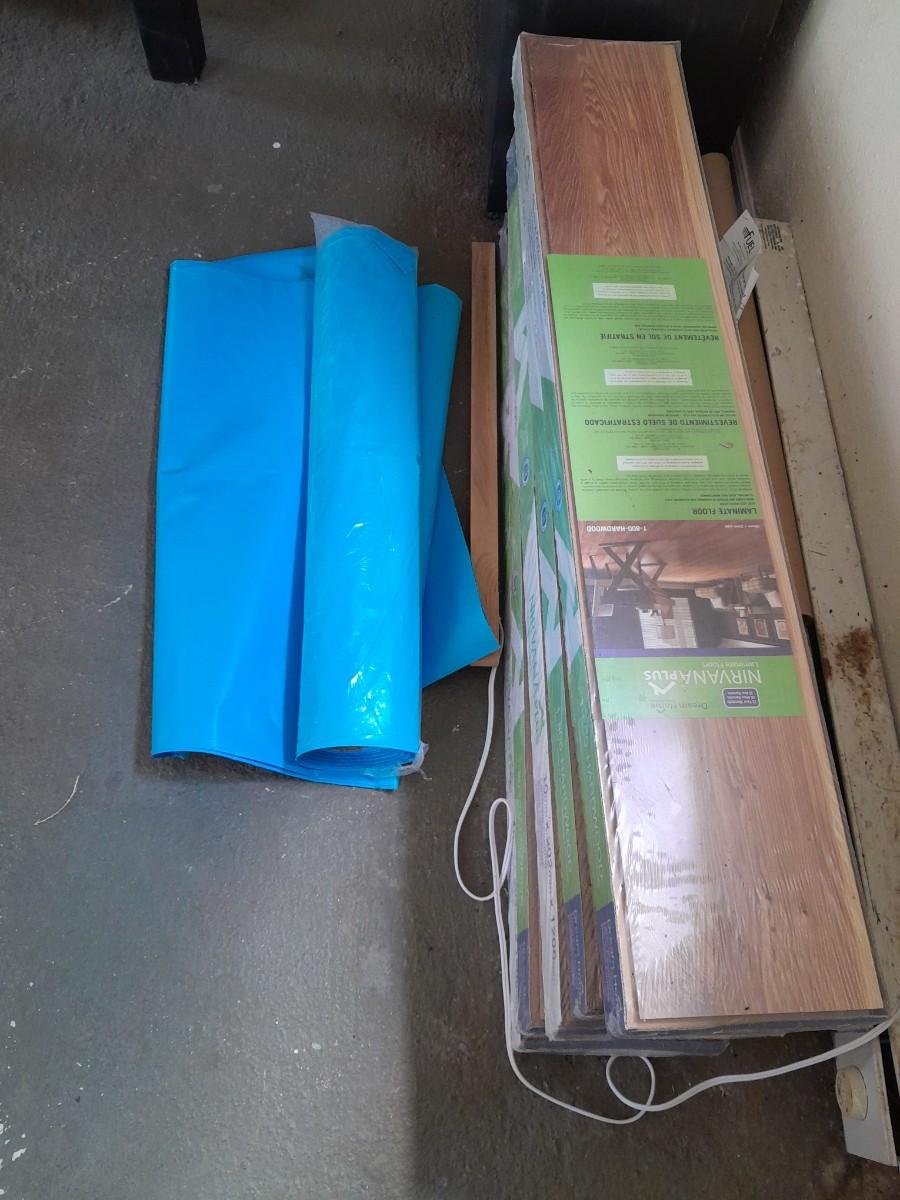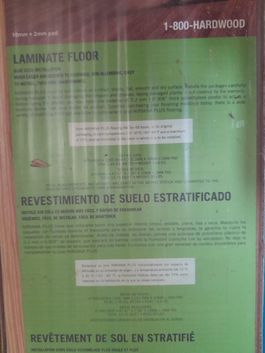 FOUR BOXES OF NIRVANA PLUS 10MM HARDWOOD LAMINATE FLOORING WITH PARTIAL ROLL OF UNDERLAYMENT.