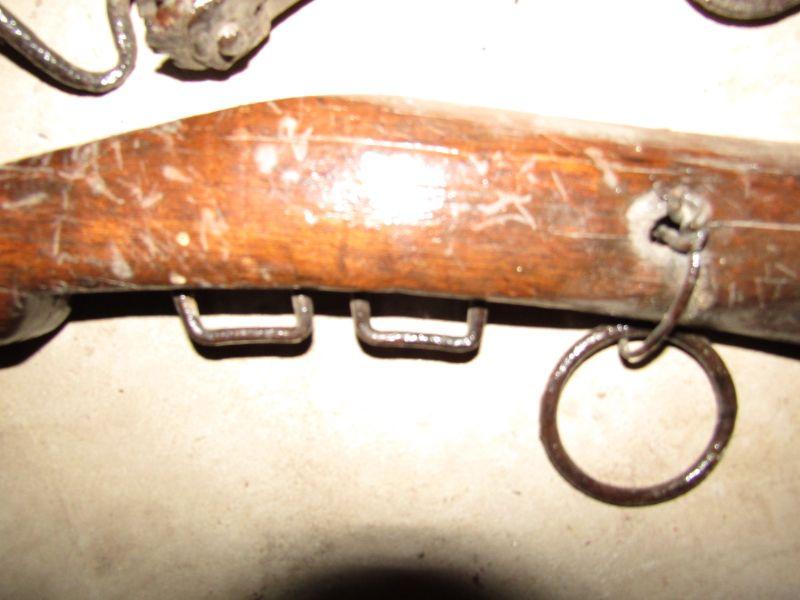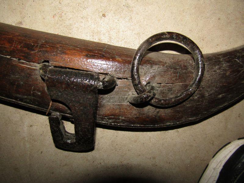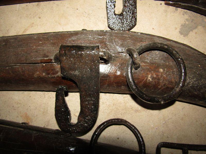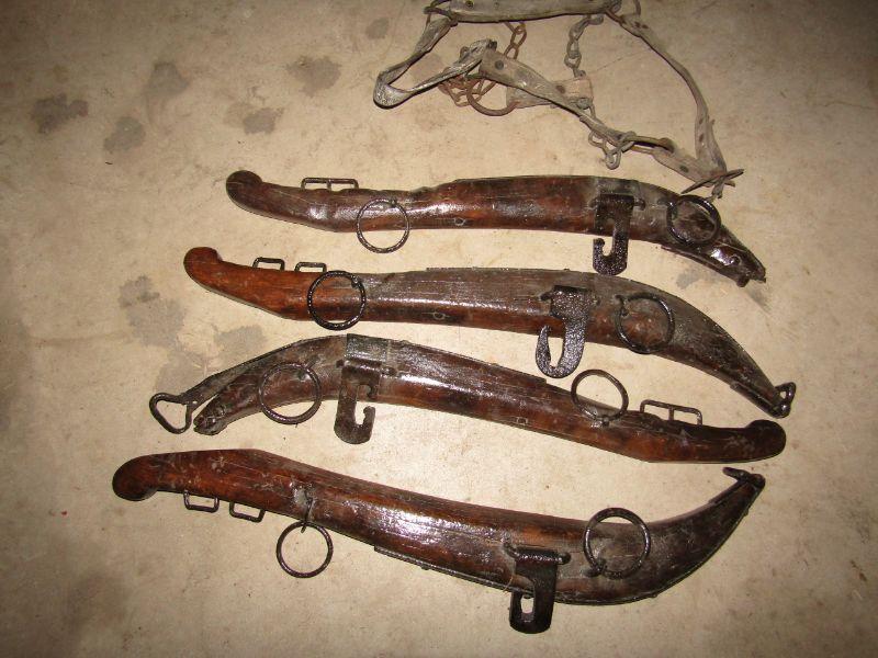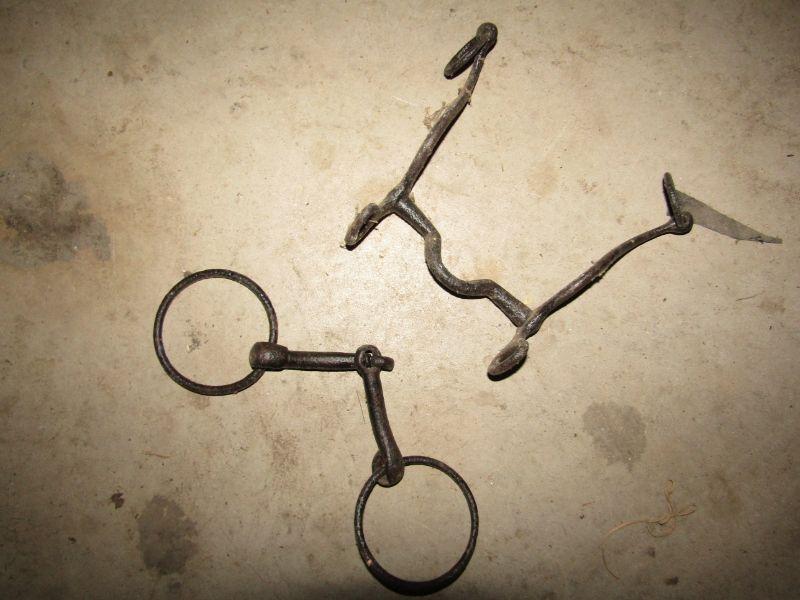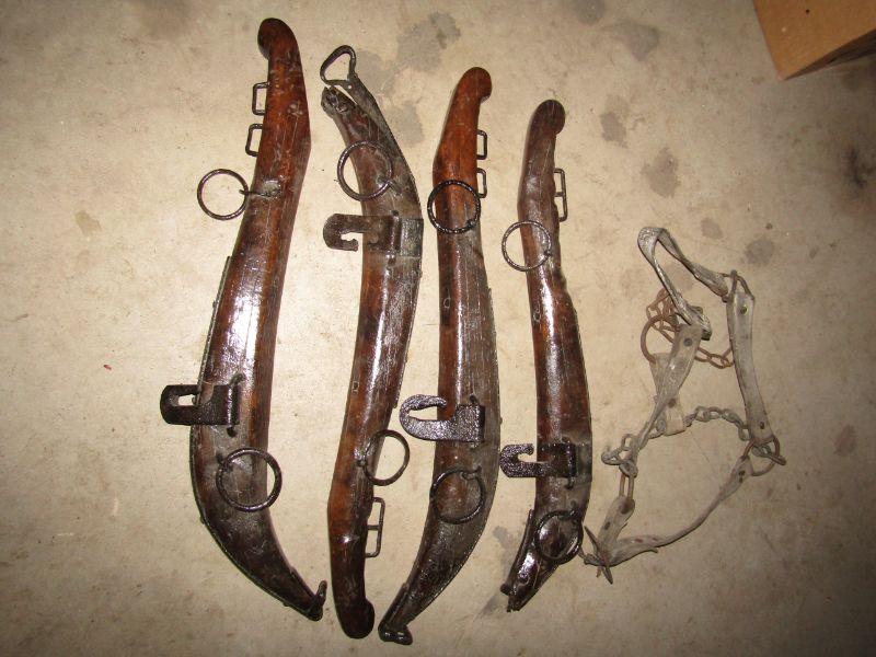 VINTAGE HORSE YOKES AND HORSE BIT. THE WOOD IS STARTING TO CRACK ON A FEW YOKES WHERE THE IRON IS PLACED