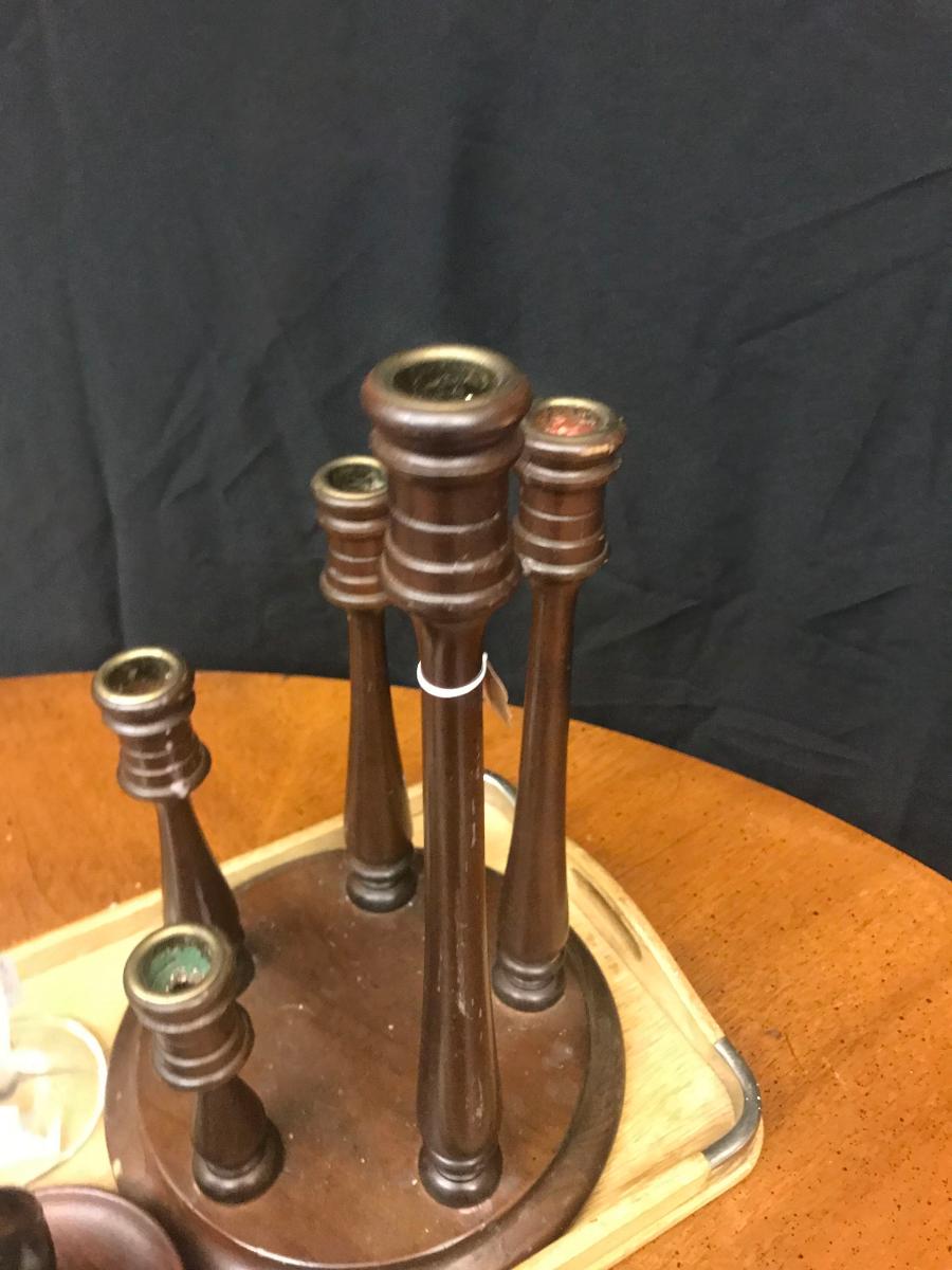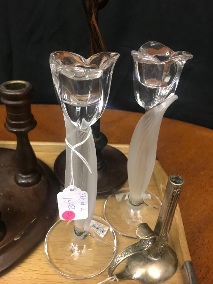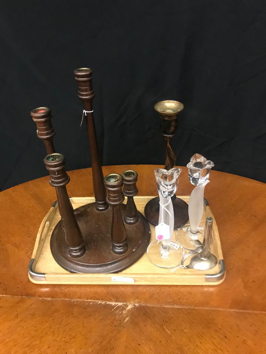 home decor :lot wood, resin, sterling and crystal candle holders and wood tray with silver accents;