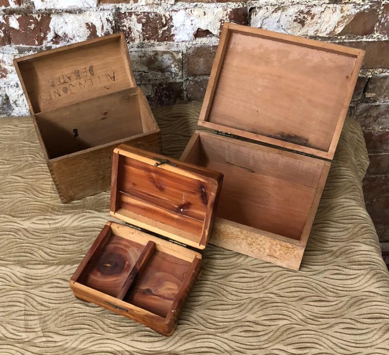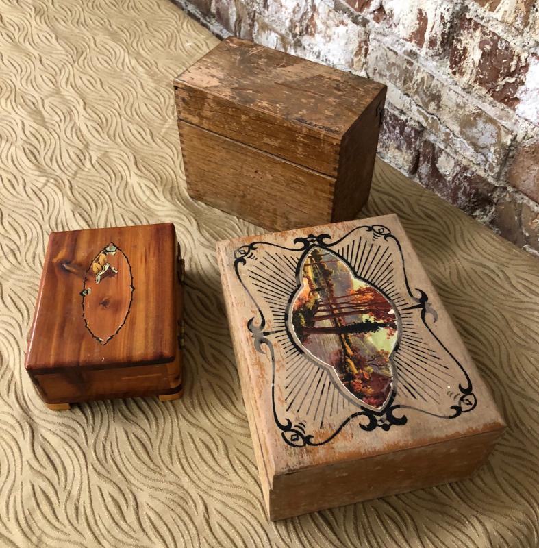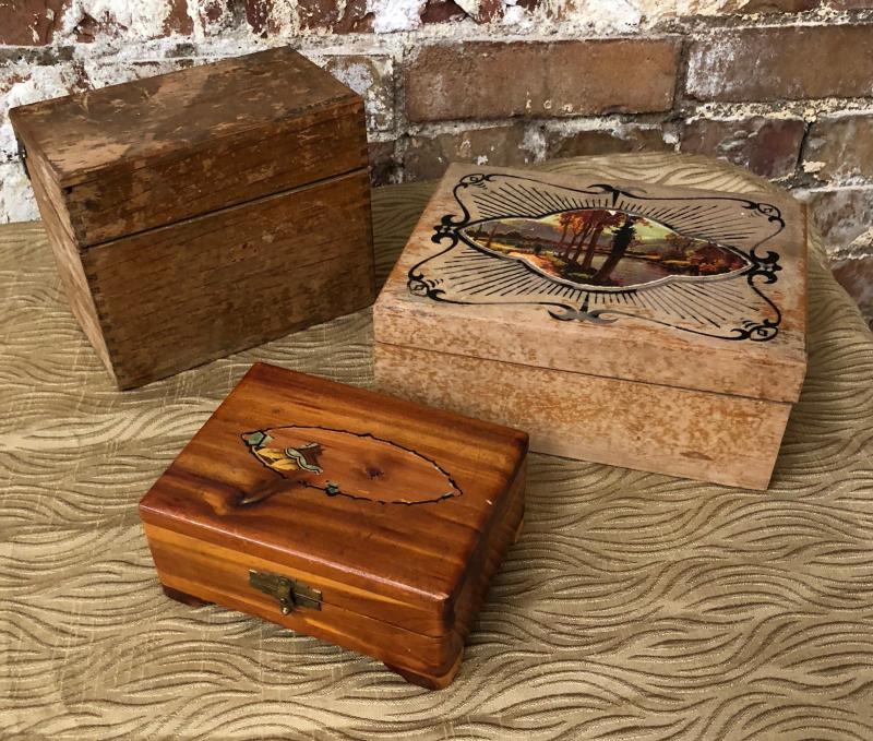 Three uniquely crafted wooden boxes in this vintage lot..as shown...