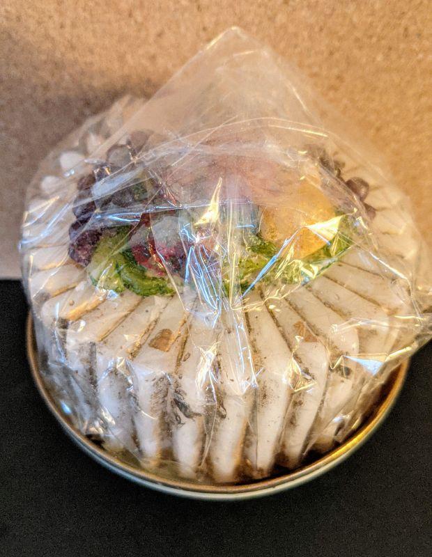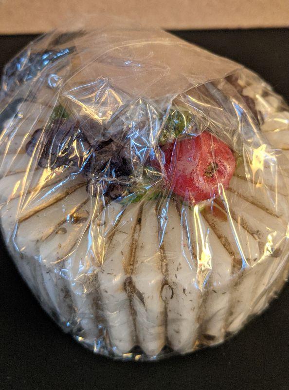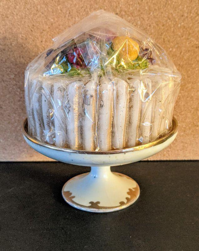 Candle is shaped like a cake or torte with fruit on top. Still in wrapper. Fits nicely on Royal Nippon pedestal candy dish. Set stands 5" tall.
