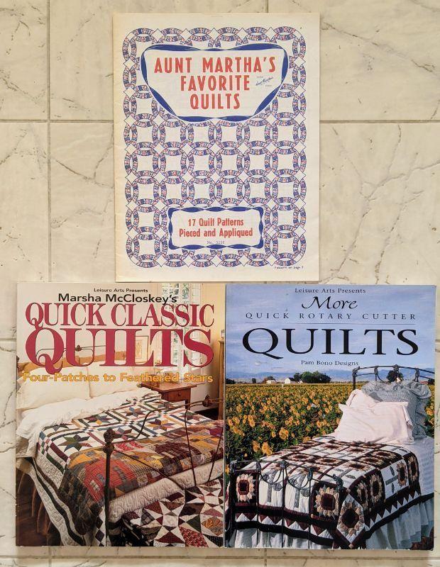1. Vintage Aunt Martha's Favorite Quilts 17 quilt patterns, pieced and appliqued #3230 16 pg booklet 2. More quick rotary cutter quilts by Pam Bono Designs - Leisure Arts 160 pg