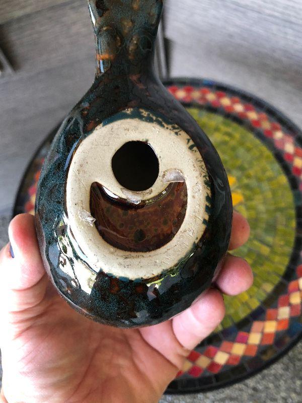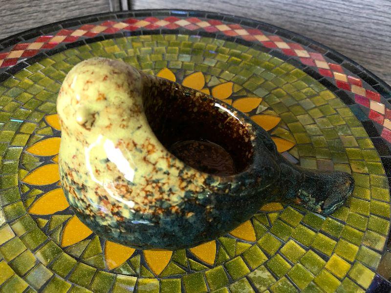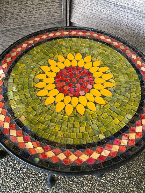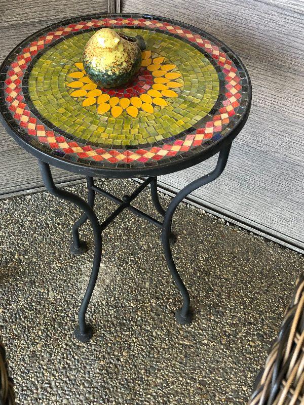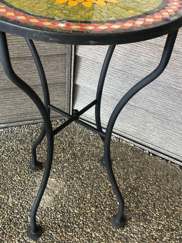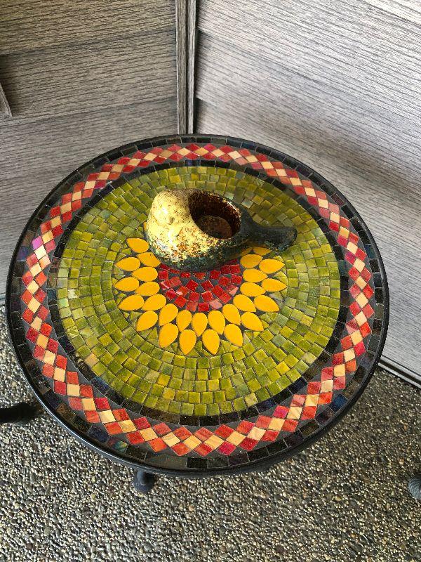Cast iron base and a mosaic top with a sunflower pattern. And a bird.