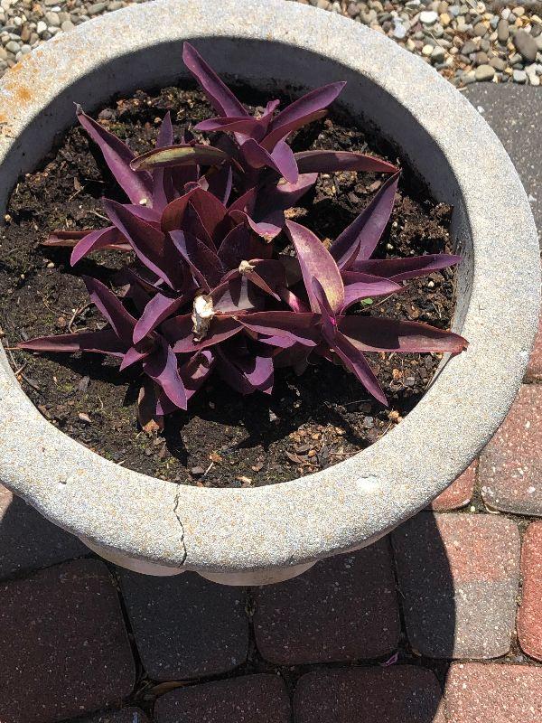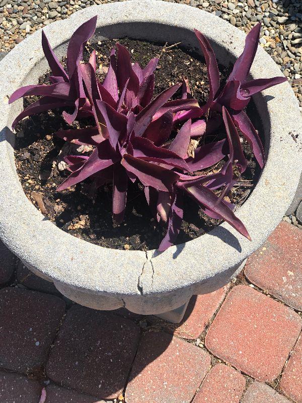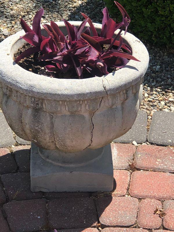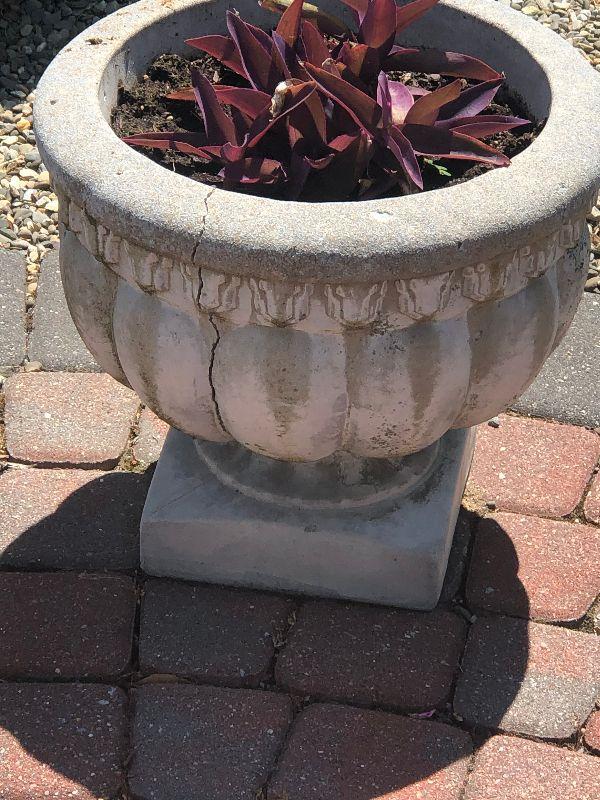 Cement planters that both have a crack, Bring help to move.