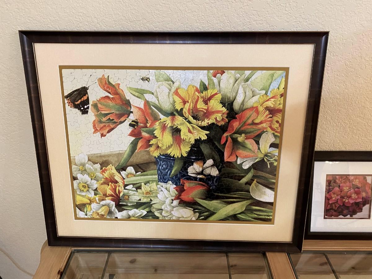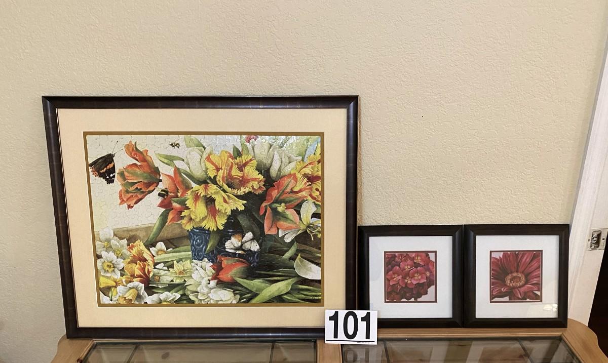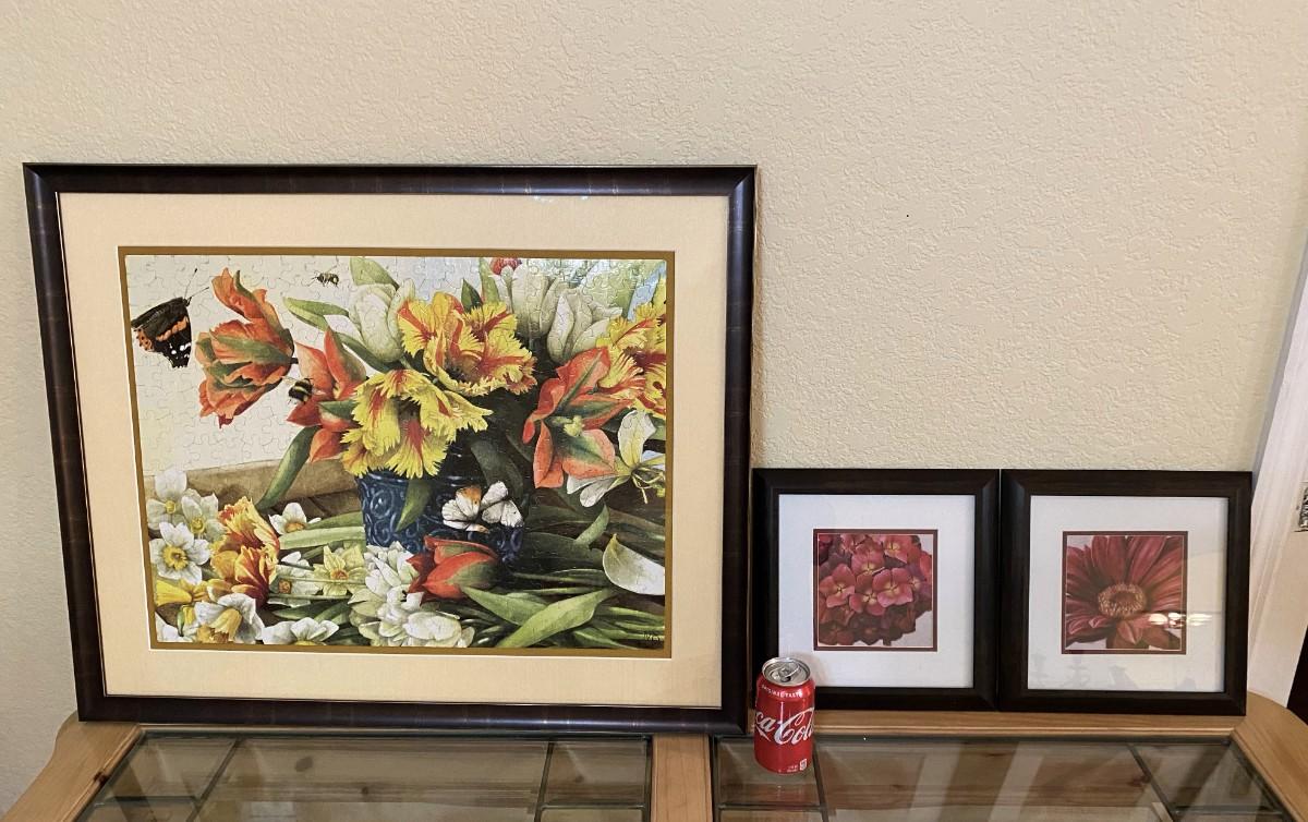One is a puzzle of a still life & two accessory pictures of flowers. Measurement: 26"H x 32"W (largest single item