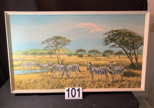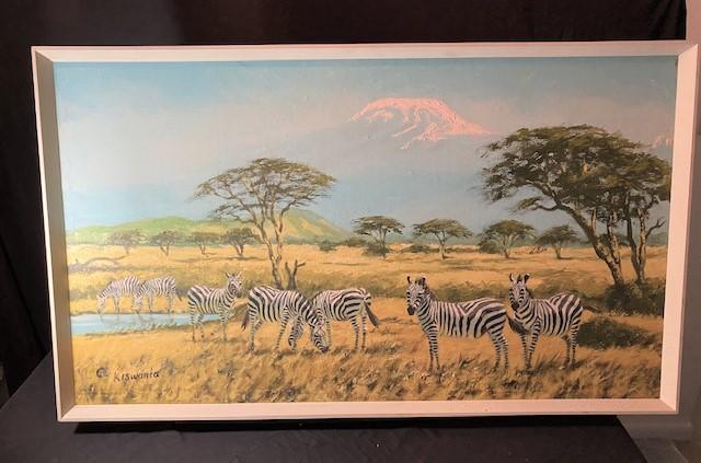 According to appraisal: "Acrylic painting on board of zebras on plain with Kilimanjaro in background. Painting signed 'C. Kiswanta'. Painting purchases in Africa from the artist." Estimated weight of lot: 3lbs. Measurement: 45"L x 26"
