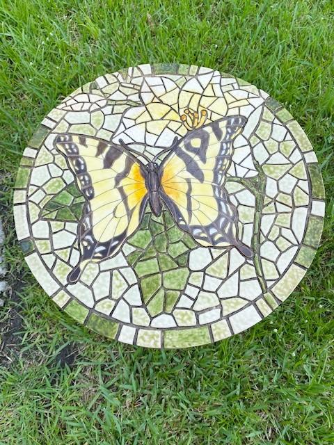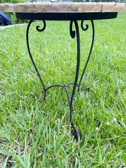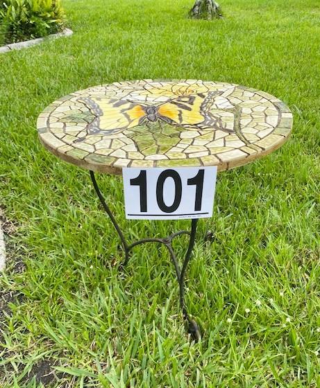 Metal pedestal. Mosaic top. Measurement: 20"H x 20"Diameter