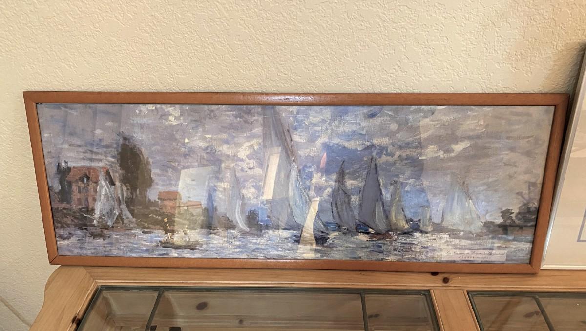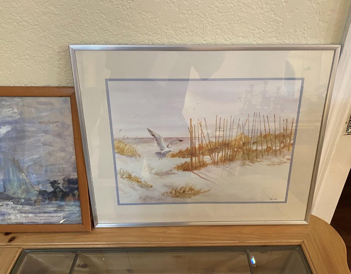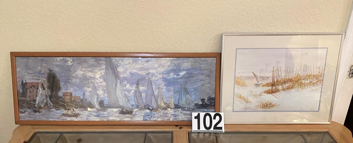 Both seaside in subject matter. One is a Claude Monet print. Measurement: 37"W (Monet; widest) | 16"H (tallest)