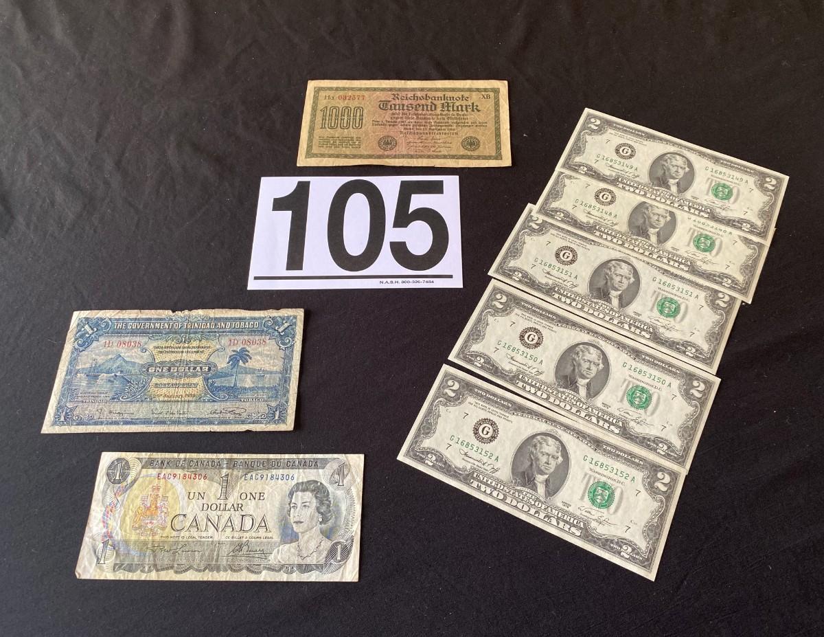 Includes: 1000 mark note, 5 uncirculated US $2 dollar bills, Canadian dollar, & Trinidad Tobago Dollar. * US $2 dollar bills are in sequential order.