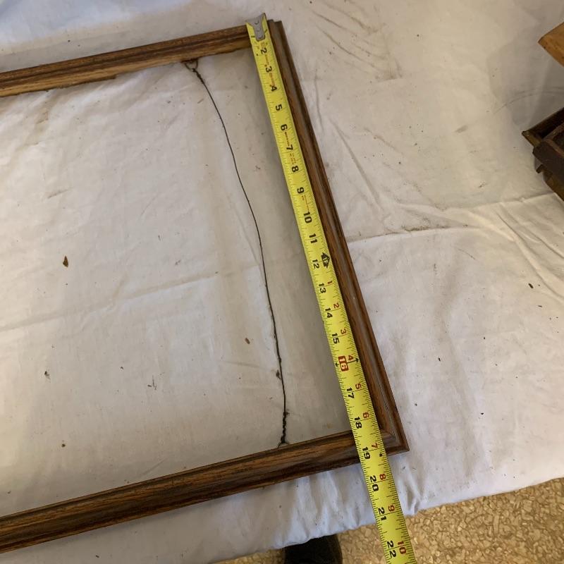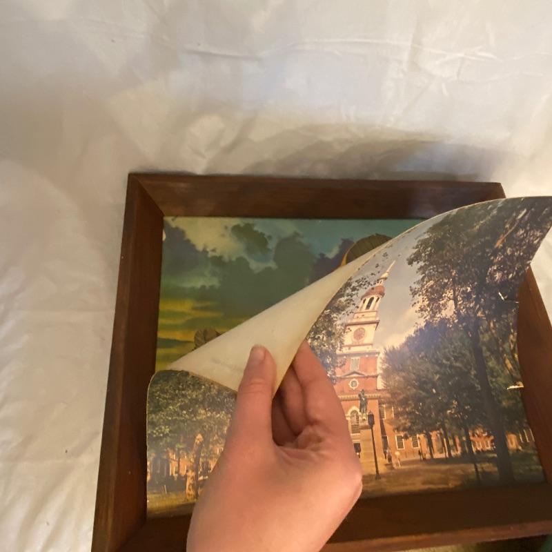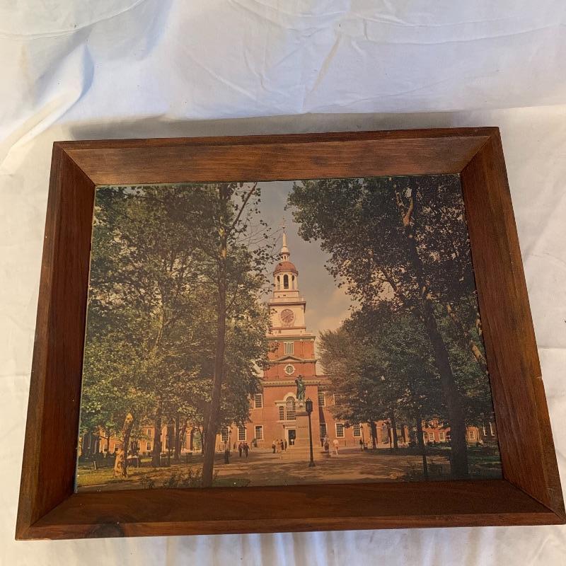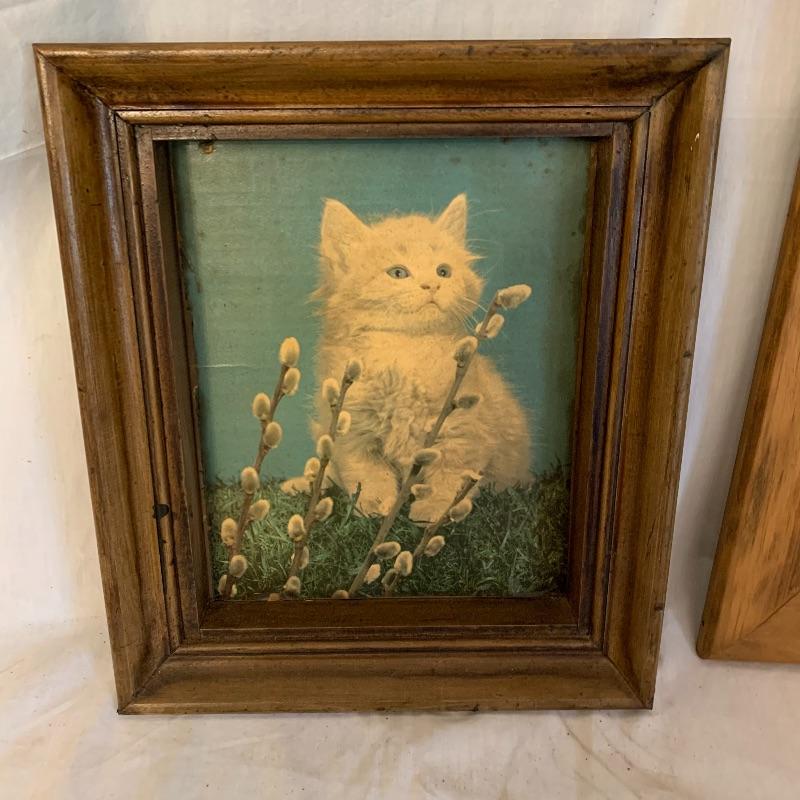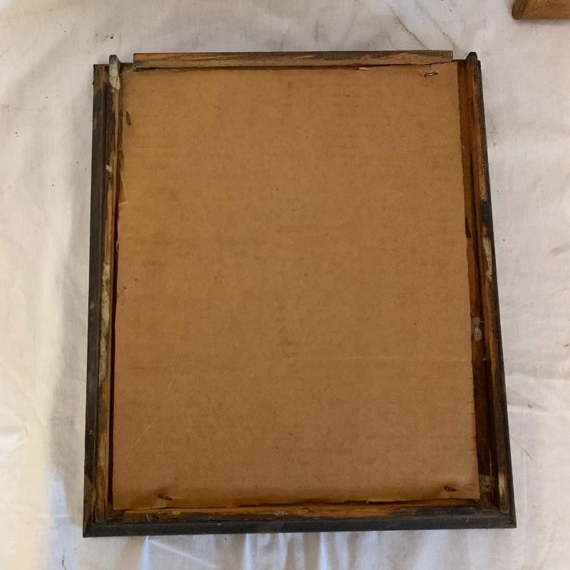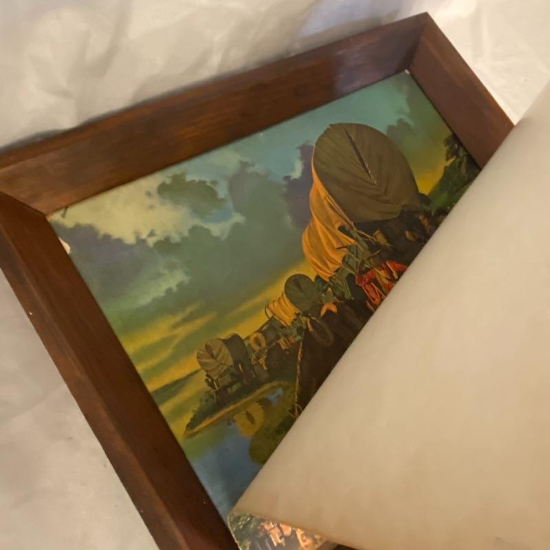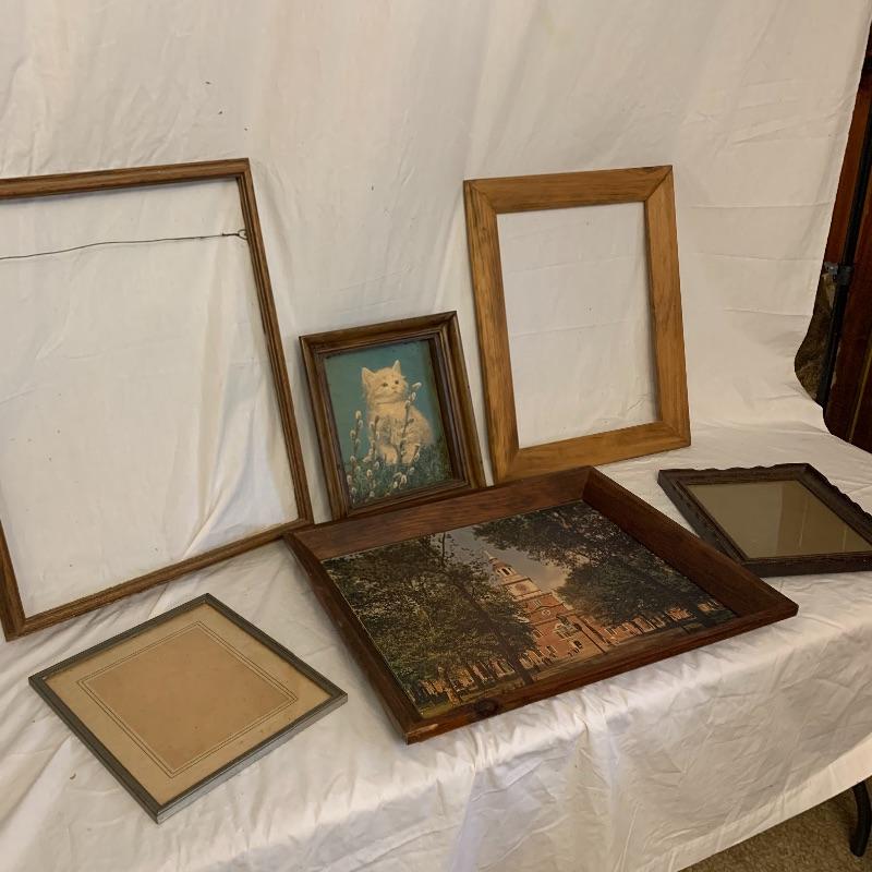 Enjoy these pieces and get ready to frame some art. This lot includes an adorable 14” x 12” framed piece of a little white kitten. The other is of Independence Hall and has some damage (see pic). There is another picture of covered wagons behind the photo (see pic). In addition there are four empty frames, see pics for sizes. Local pickup only.