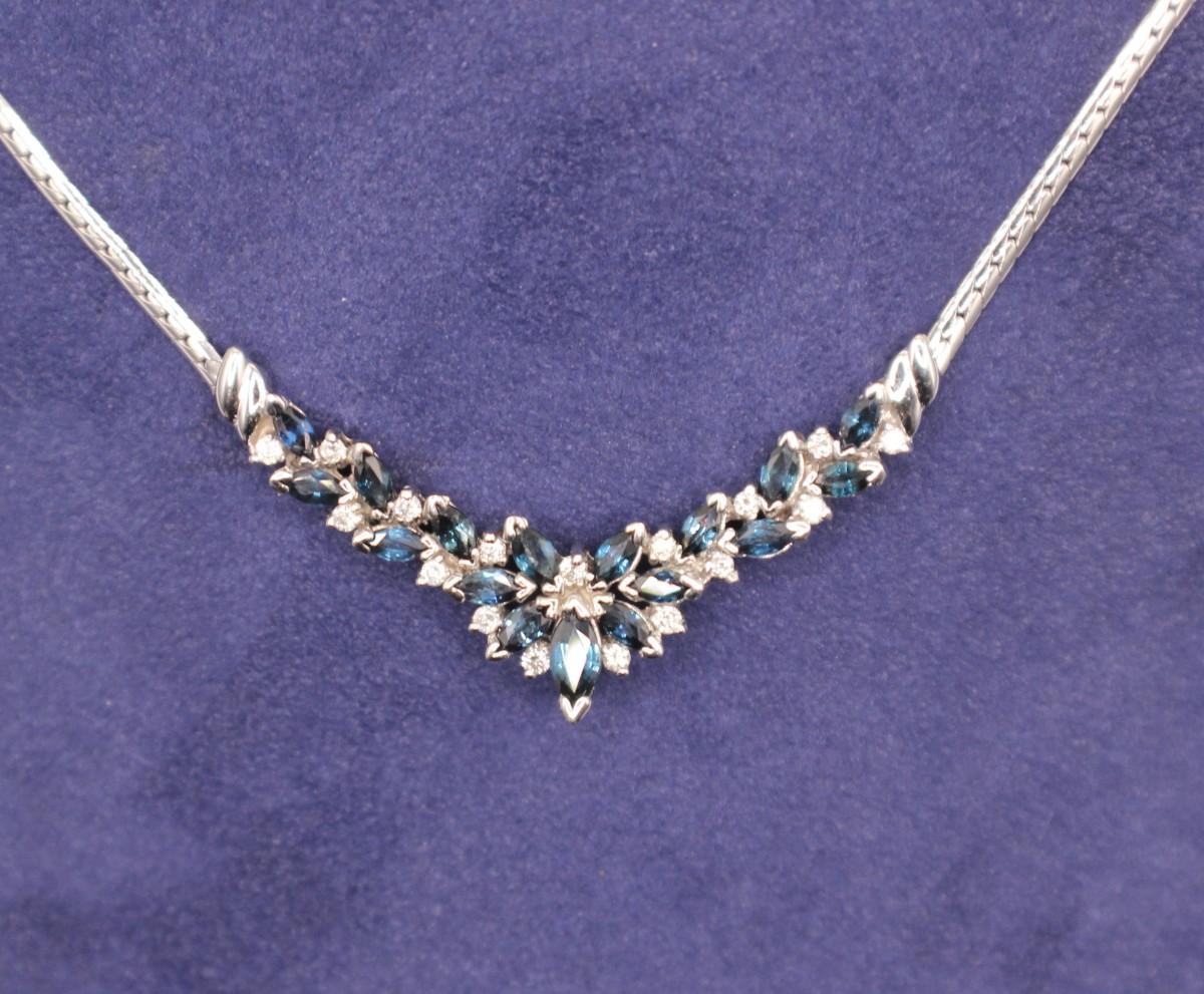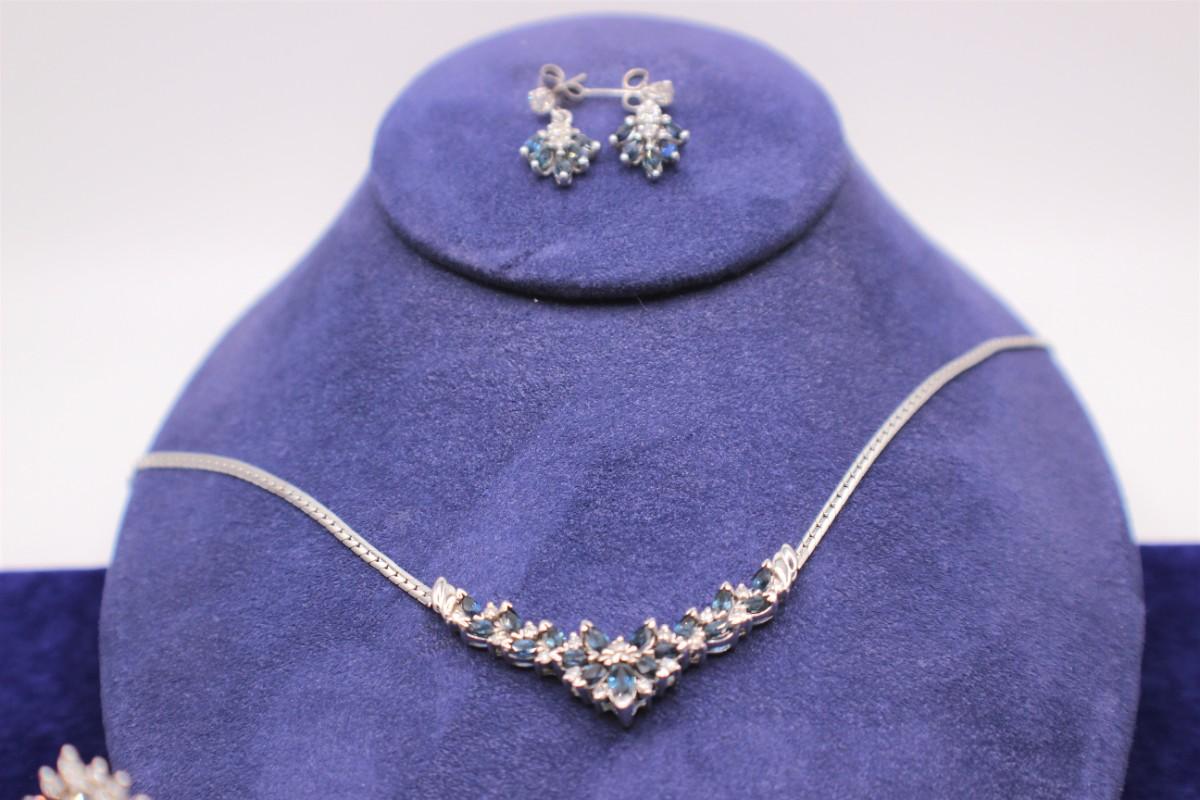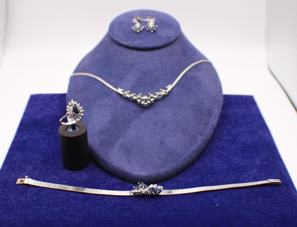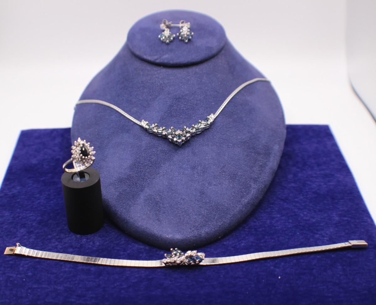 Ring size 3.5. Bracelet length 7.25". Necklace length 16". Earrings .75"long. "Sapphire" & "Diamond" confirmed with Gemoro Ultra Tester 3.