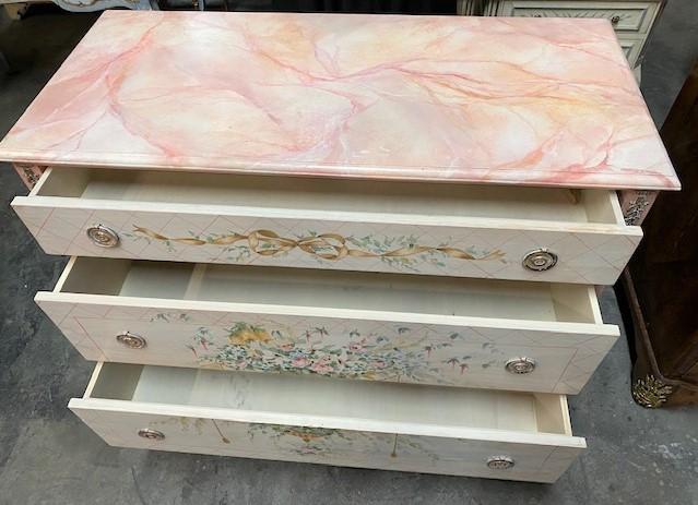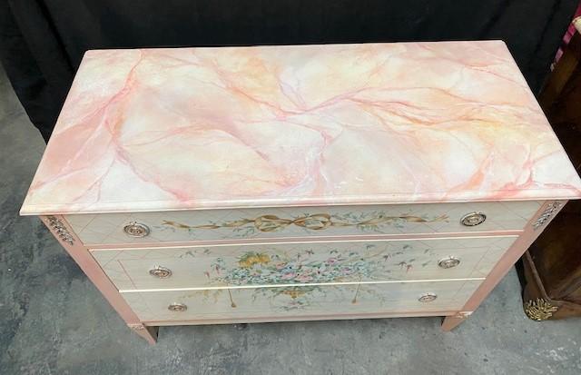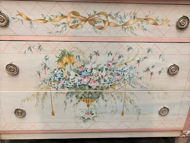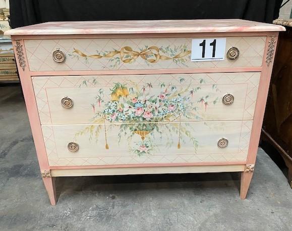 3 drawers. Appears to be hand-painted. With some distressed brass fixtures. Estimated total lot weight 100lbs. Measurements: 37"H x 20"D x 45"W.