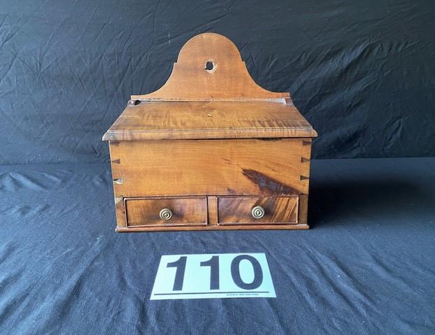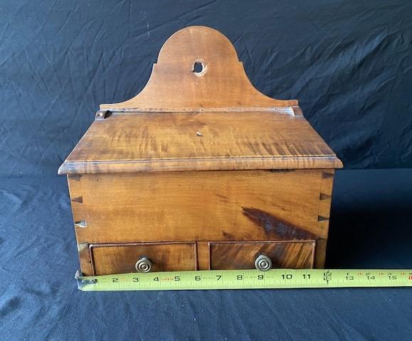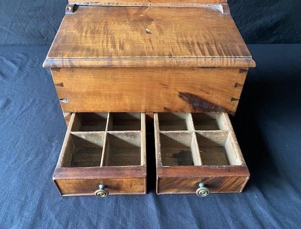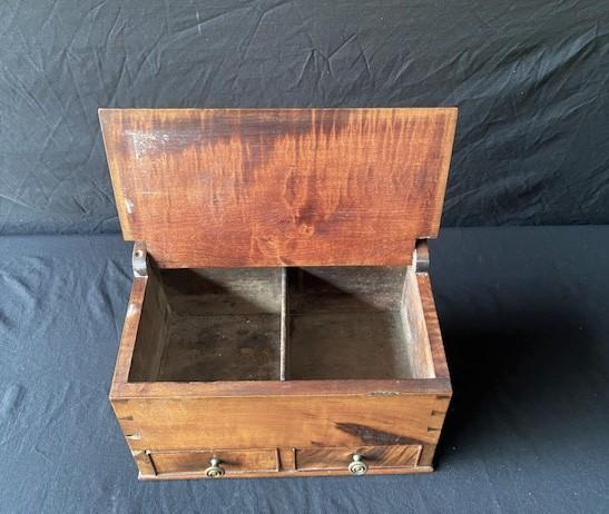 Two drawers & flip up top. Visible dovetails. No serious condition issues. Estimated weight of lot: 5lbs. Measurement: 12"W x 12"H x 8"D